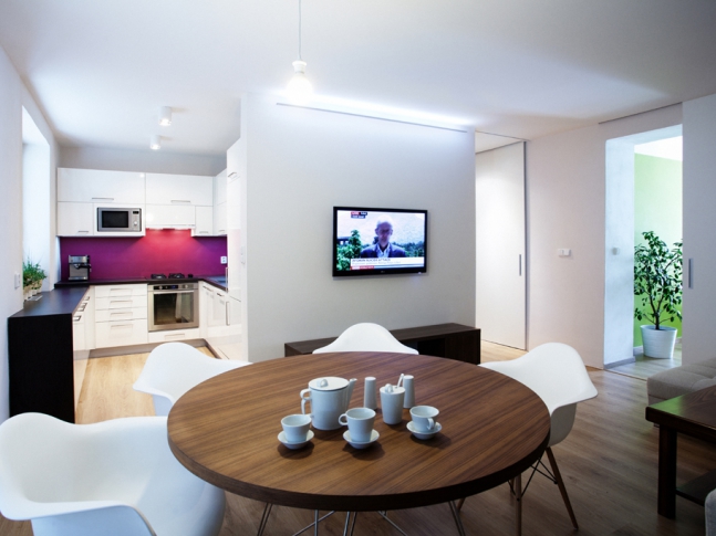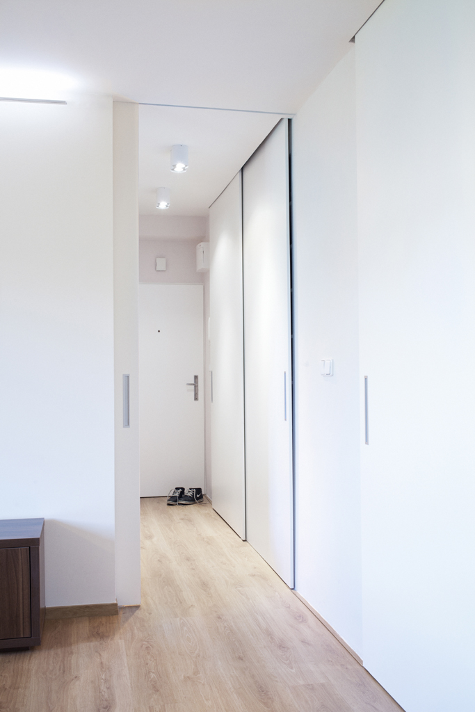 Rekonstrukce bytu T03B 54m2 byla navržena s ohledem na maximální funkčnost a jednoduchost užívaní jednotlivých častí bytu. Kuchyně je propojena s obývacím pokojem a tvoří jeden prosvětlený celek. Samostatným pokojem je ložnice, jejíž součástí je prostorná šatna s dostatkem úložného prostoru. Důležitým prvkem bytu jsou posuvné dveře mezi obývacím pokojem, ložnicí a chodbou.