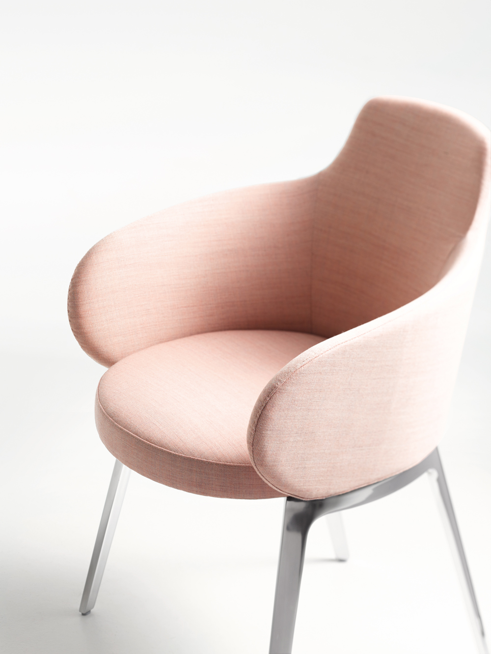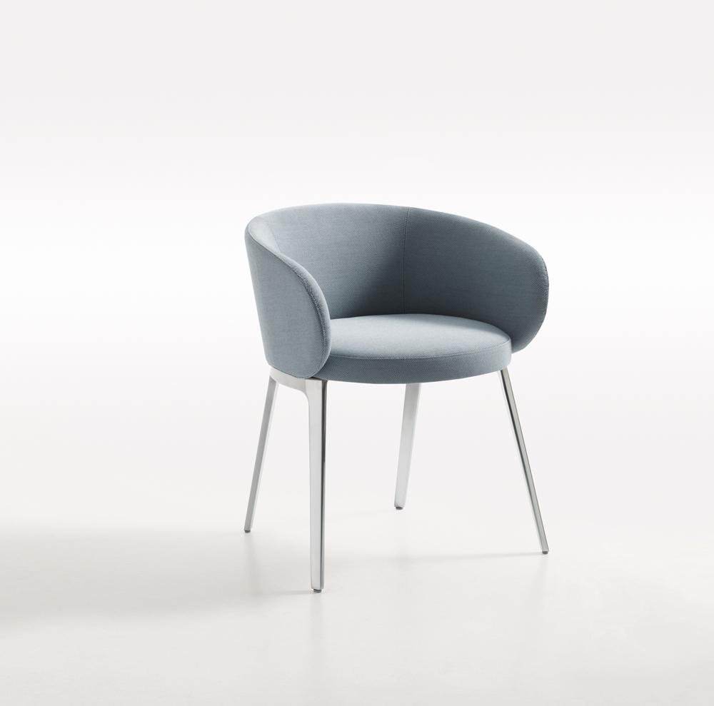 Čalounění konstrukce oblých tvarů tvoří kůže nebo látky různých barev. Židle se vyrábí ve dvou výškách opěráku – nižší nebo vysoká. Podnož je tvořena dvěma protilehlými hliníkovými sponami, v leštěném nebo barevně lakovaném provedení. Svým vzhledem je natolik univerzální, že může být doma kdekoliv. Doma, v bistru, v pracovně, u jídelního stolu nebo v obývacím pokoji.