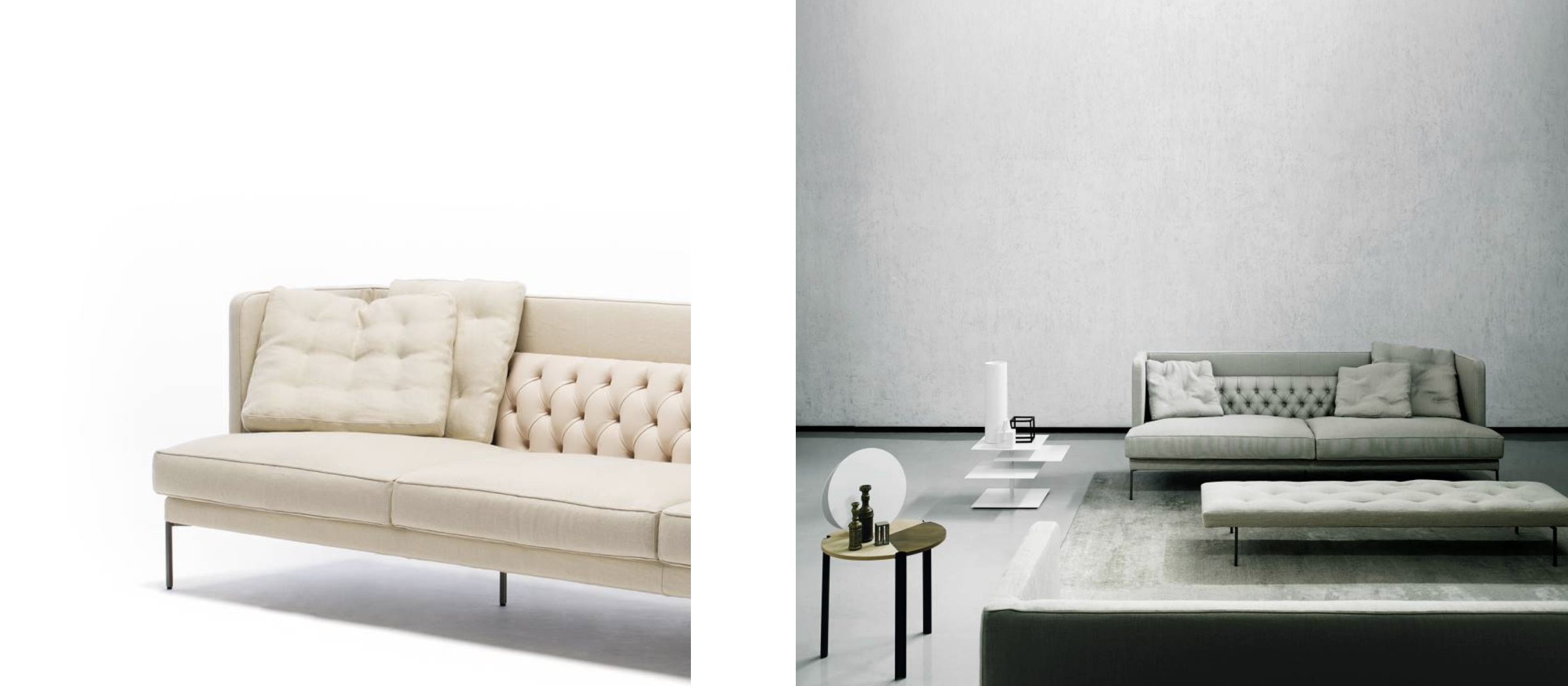 Sedačka Lipp designéra Piera Lissoniho, která interpretuje luxusní capitonné styl s moderním geometrickým duchem.