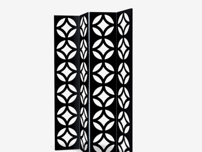 Jay, kus nábytku s vyřezávaným vzorem, který dokáže definovat interiér. Tato ručně vyrobená skládací zástěna je vyrobena z dřevěných panelů.