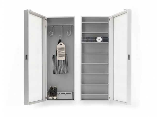 Box je elegantní kus nábytku. S hloubkou pouhých 20 cm se tato skříň stává jednoduše přenosnou. Vše se skrývá za zrcadlovými nebo skleněnými dveřmi s využitím jak v domácnostech, tak i v kancelářích. Otevírání dvěří lze na obě pravou i levou stranu, stačí skřín otočit o 180°.