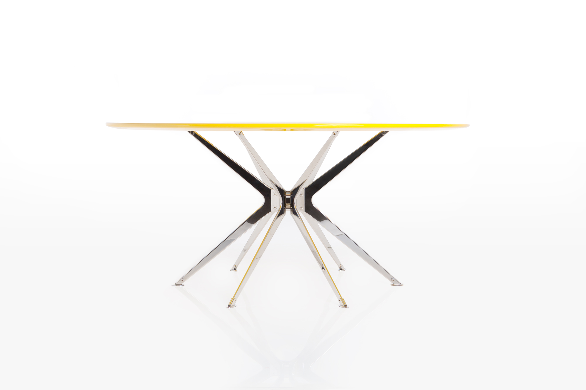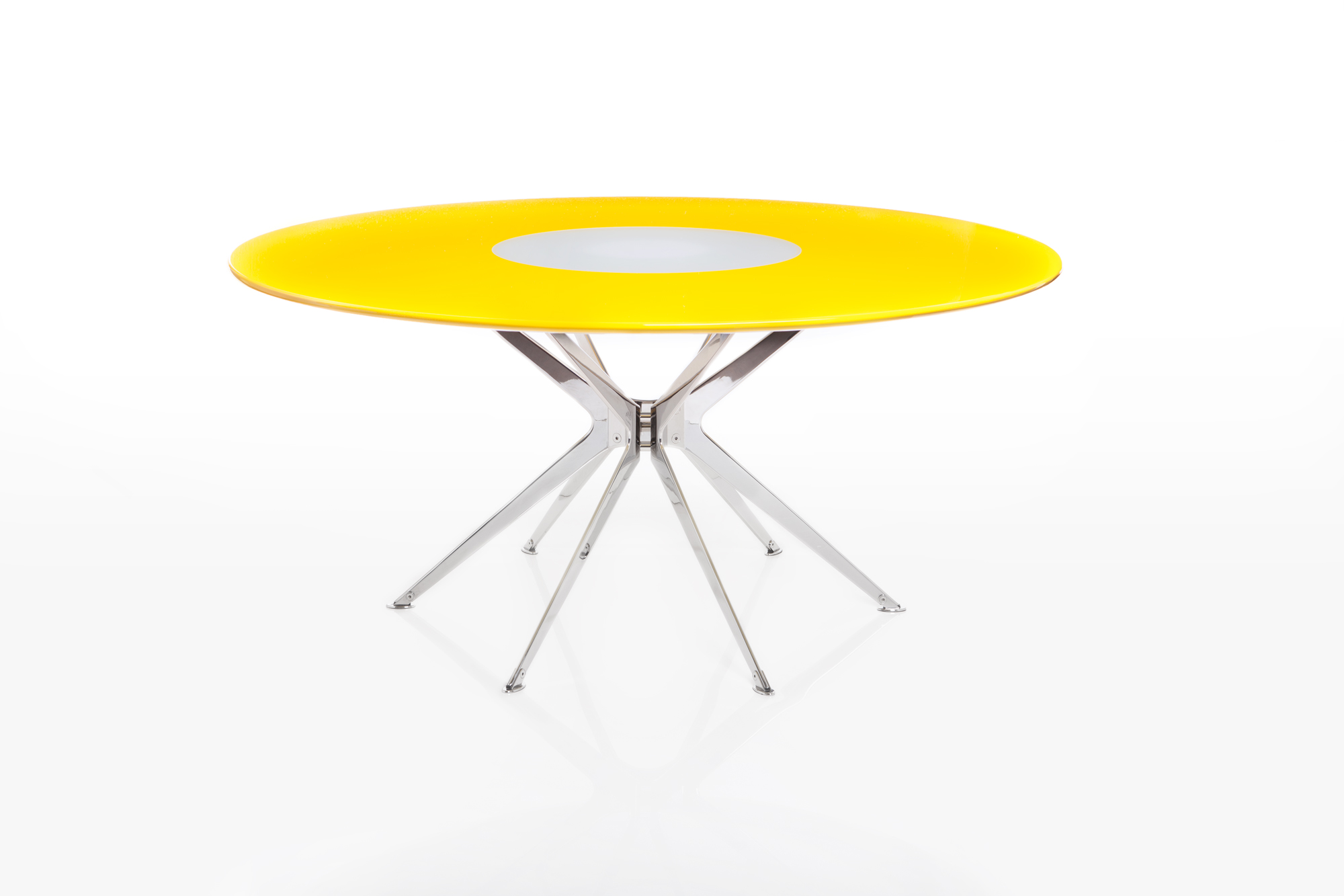 Stůl má uprostřed desky kruhové sklo, které je směrem od obvodu ke středu pískováno do ztracena. Skleněný střed stolu lze jednoduše vyjmout a v budoucnu bude možnost dokoupit otočnou desku, mělkou nádobu na led nebo praktický dřevěný střed na odkládání horkého nádobí.