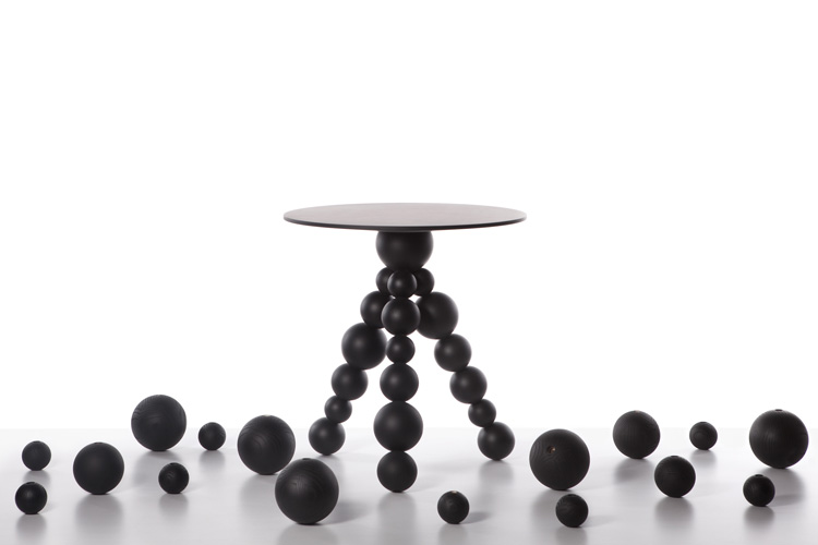 Vzniklá forma sice evokuje spíše shluk molekul, ale ve skutečnosti ji tvoří soustružené koule z přírodního nebo lakovaného dubového dřeva. Pohromadě jednotlivé objekty drží lanko – podobně jako perly v náhrdelníku. Působivou strukturu přitom vytvářejí různé průměry koulí. Systém konstrukce díky tomu nabízí individuální možnosti a kombinace.