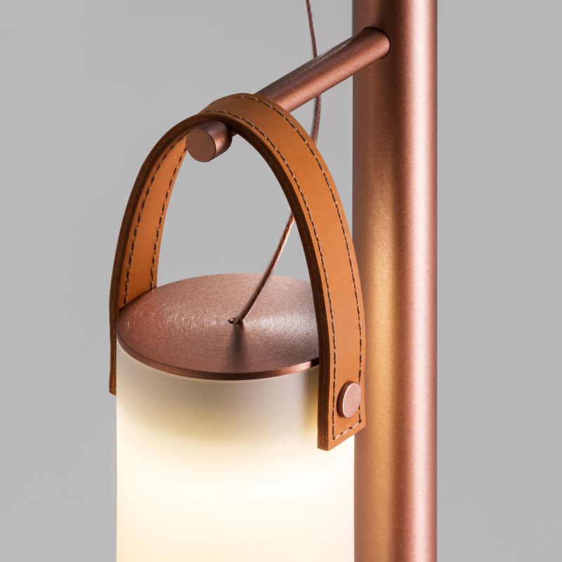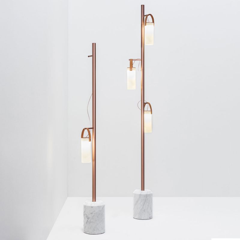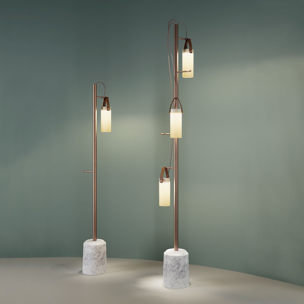 Stojací lampa inspirovaná antickými lampami. Stěžejními materiály jsou sklo, kůže, kov a mramor. Výrobce: FontanaArte