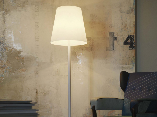 Nejklasičtější z podlahových svítidel, vybavené difuzorem v matném bílém opálovém foukaném skle a základnou a stopkou v jednom kuse.