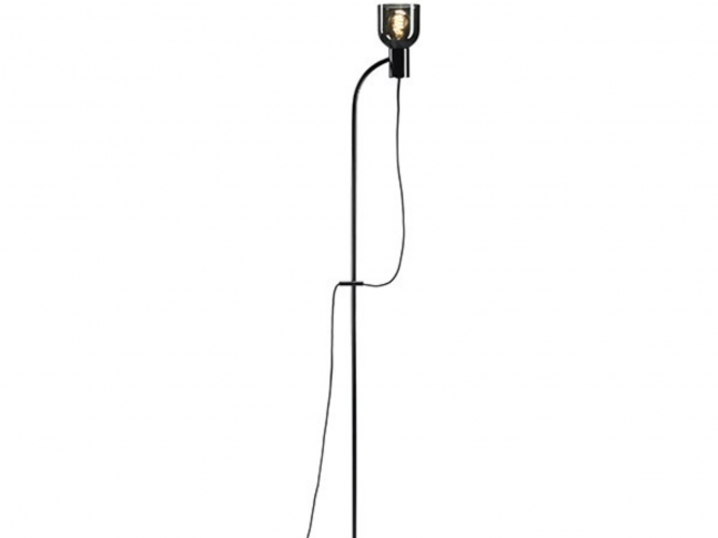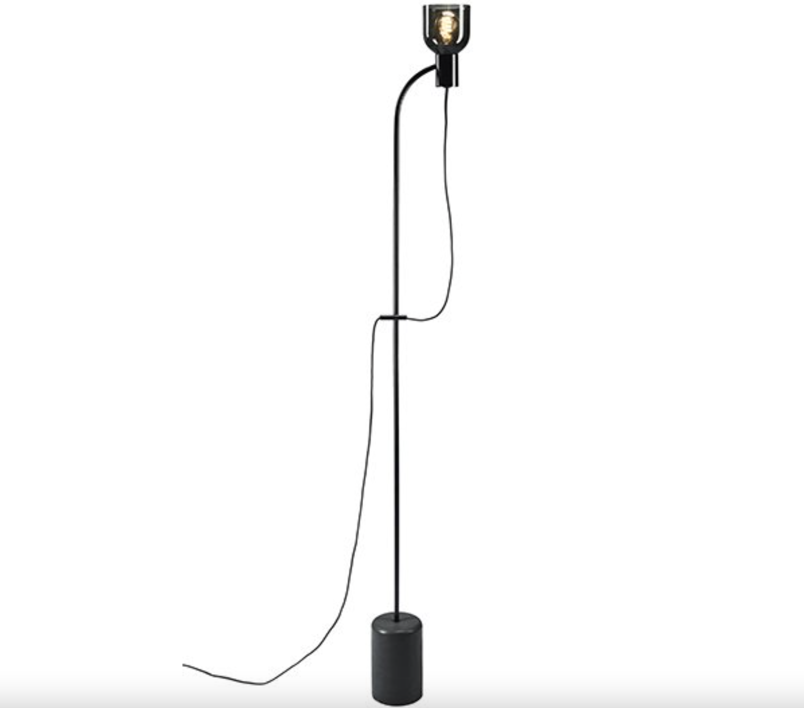 Stojací lampa Meta je součástí stejnojmenné kolekce osvětlení. Širm je vyroben z kouřového skla, zatímco základna z robustního betonu a tělo z práškově lakované oceli v černém dokončení. Černý kabel je doplněn vypínačem. Poskytuje jemné a rozptýlené světlo.