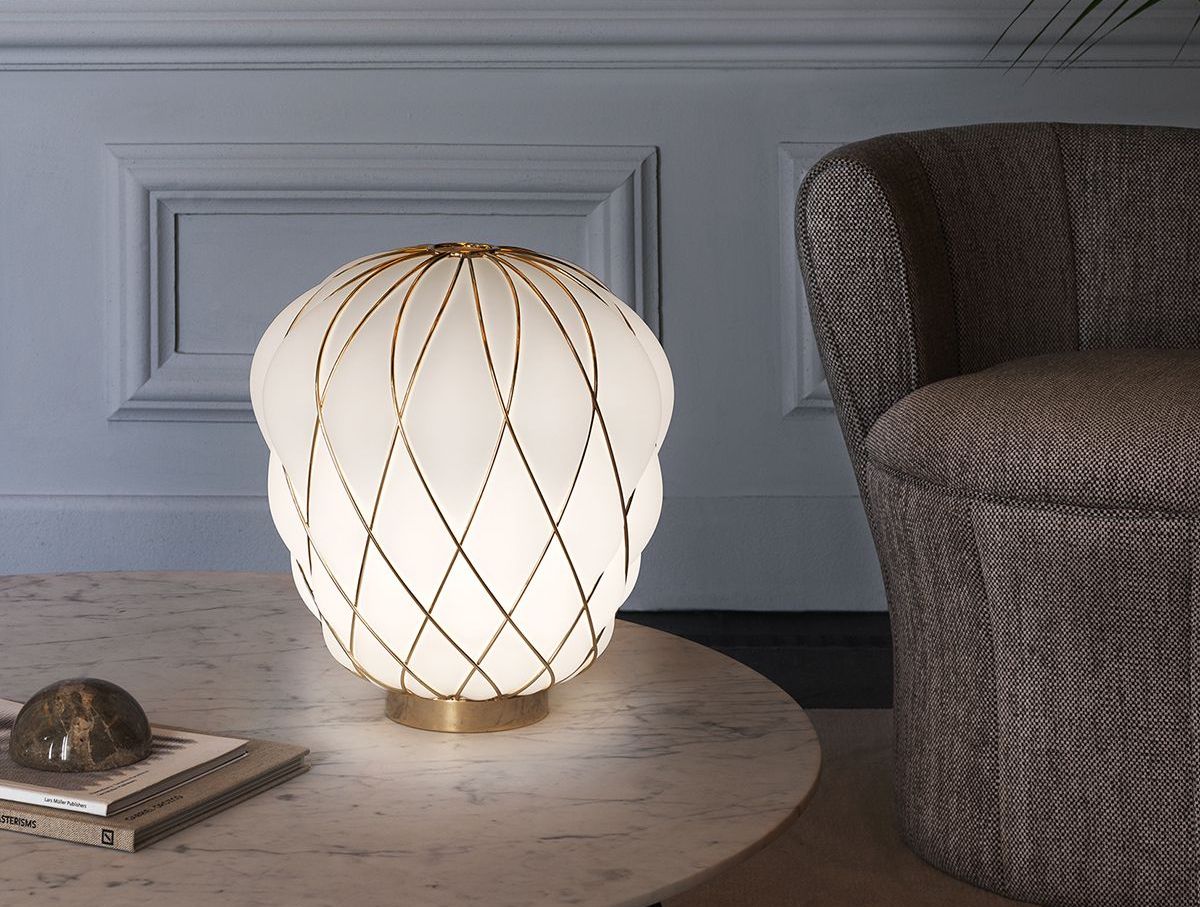 Pinecone je závěsná lampa a je k dispozici v lesklé, průhledné nebo mléčně bílé verzi. Koule se vyrábí za použití staré techniky foukaného skla: výrobník skla fouká roztavenou skleněnou kuličku do kovové klece. Skleněná koule je částečně zachycena a částečně uniká z klece, a vytváří tak dojem napětí.