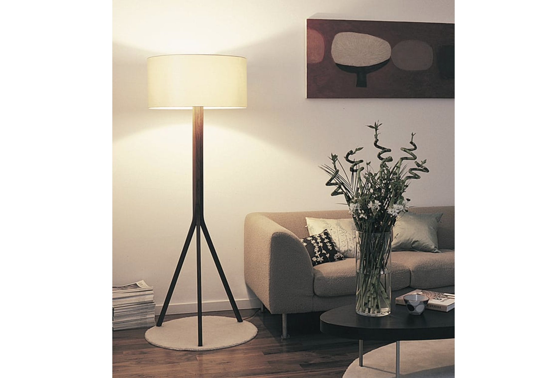 Stojací lampa Trico z masivního ořechového dřeva ručně ohýbaná díky parnímu procesu, kde je materiál ponechán přes noc aby si zachoval svůj ohnutý tvar.