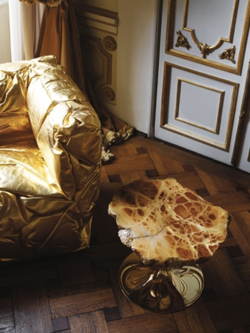 Stolek s alabastrovým povrchem v různých výškách a barvách, s nepravidelnými a zubatými okraji, které z něj z pohledu zvrchu dělají kousek, připomínající ostrůvek.