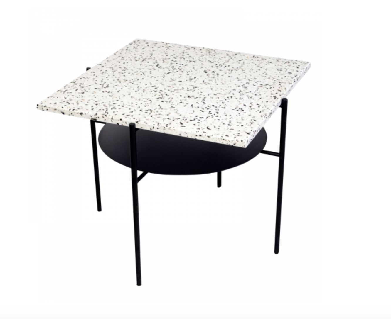 Konferenční stolek Confetti spojuje zakázkovou terrazzovou desku s ocelovým rámem s práškovým nástřikem a s funkční kruhovou policí.