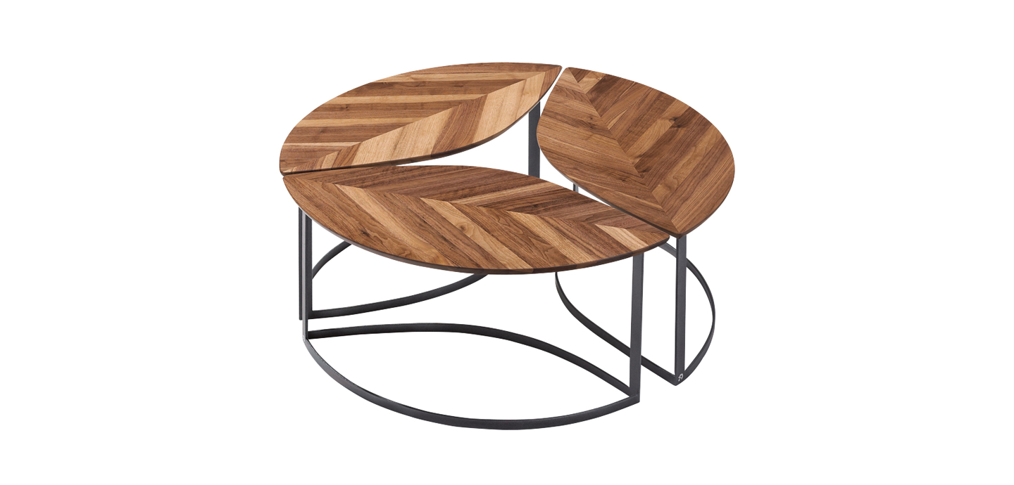 Stolek s masivní deskou díky svému tvaru i užití různých barevností dřeva připomíná list. Poslouží jako solitér, ale i ve skupině.