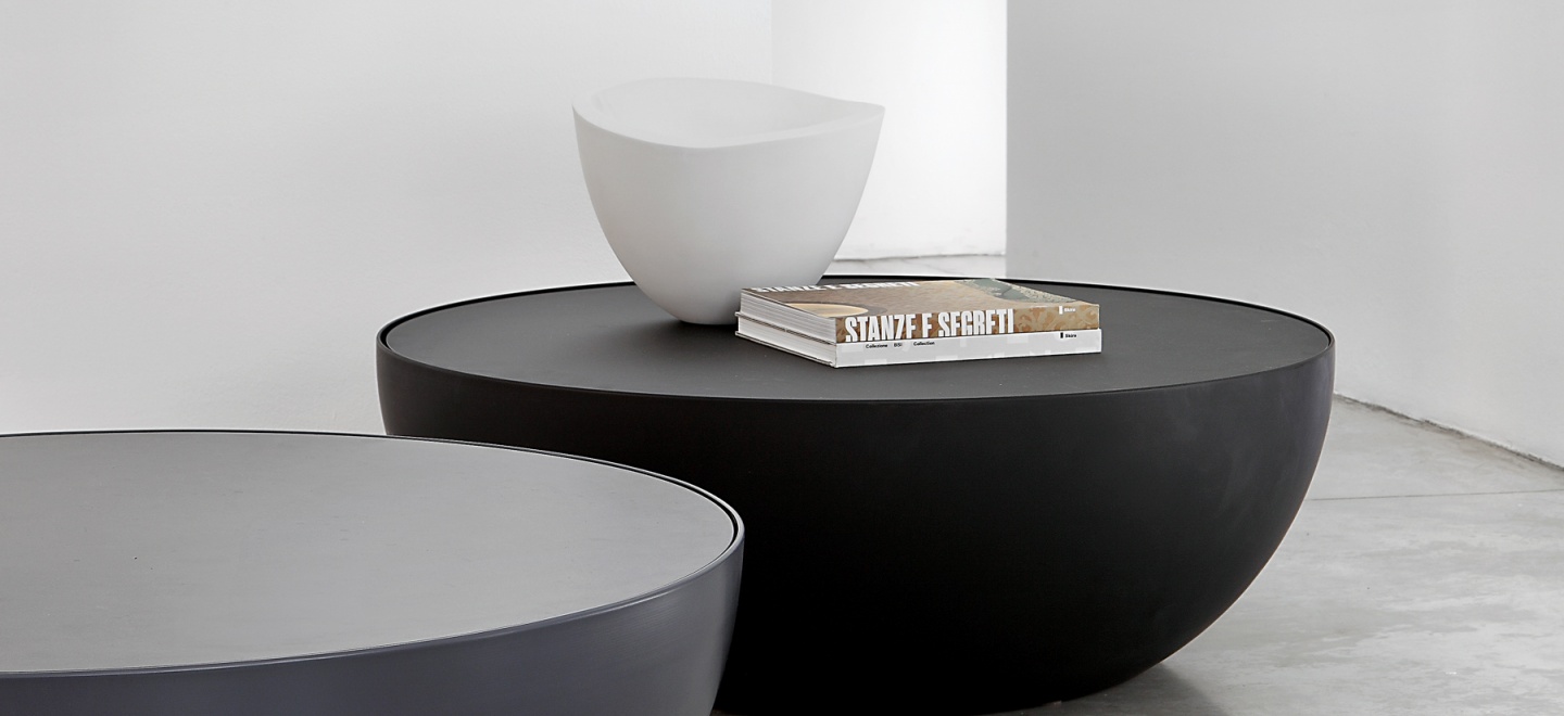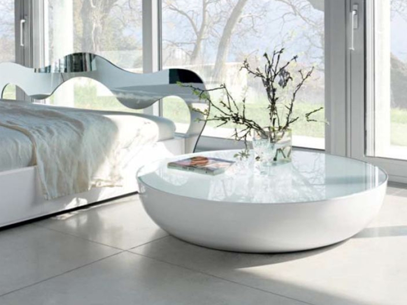 Vrchní desku stolku Planet lze vybrat lakovanou dle barvy základny, nebo doplnit čiré sklo, případně volitelně nechat prosvítit světlem.