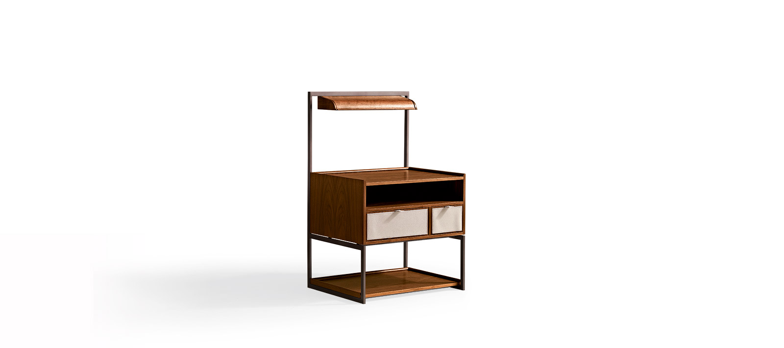 Noční stolek SYN je vybaven LED diodou. Panely rámu jsou z dýhovaného ořechového dřeva (Canaletto fin.11). Čelní strany a úchyty zásuvek jsou potaženy kůží. Kovová konstrukce a lampy jsou v barvě bronzu.