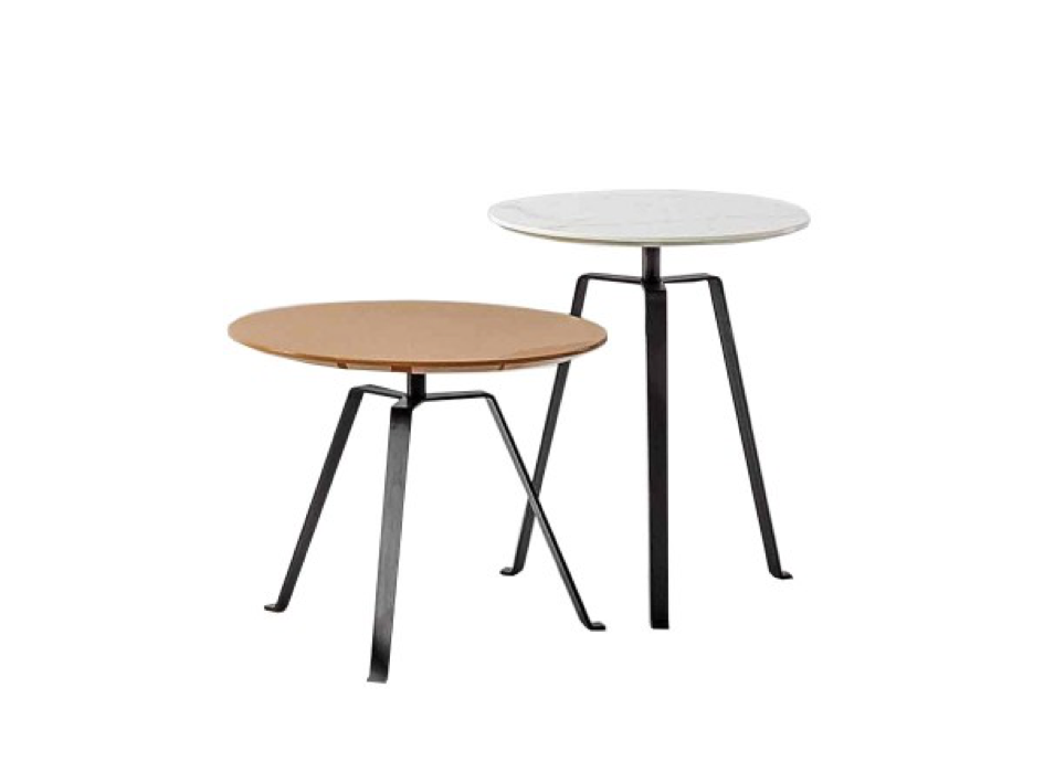 Lehkost konferenčního stolku tkví v promyšlené konstrukci, kdy kovové podnoží a desku stolu propojuje vzdušný prostor. Hravé zakončení kovových nohou zároveň zajistí stabilitu stolku. Materiál desky může být keramický, mramorový nebo ze dřeva.