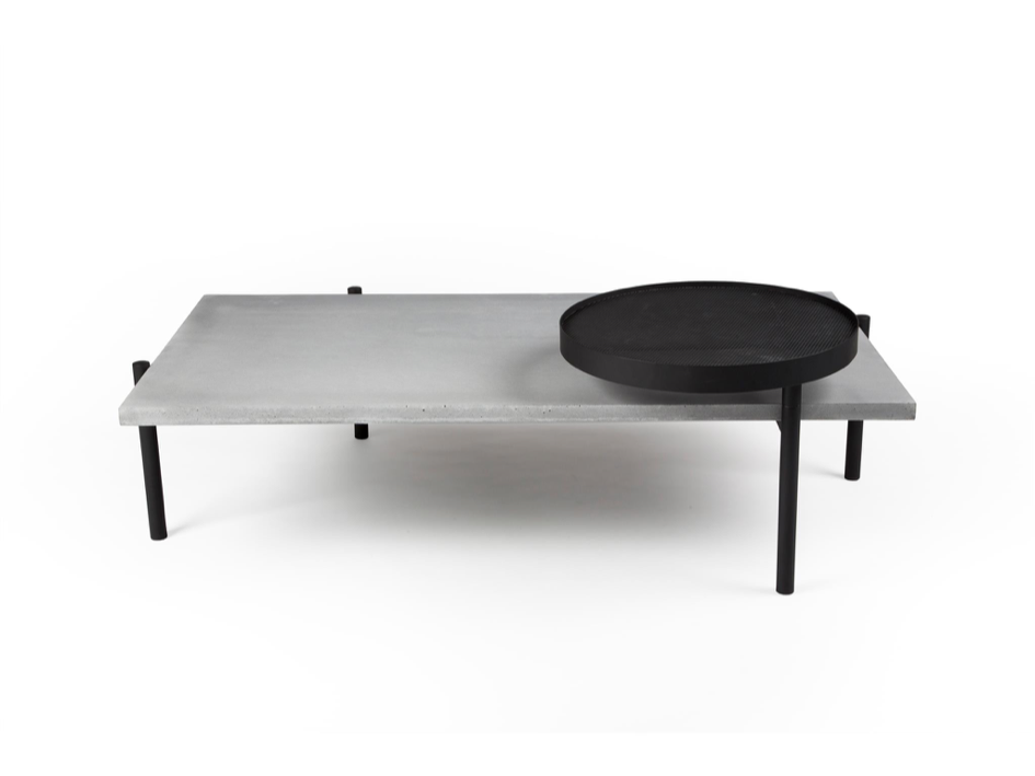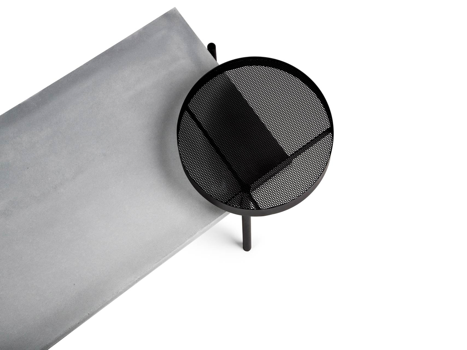 Alexandre Dubreuil navrhl pro Lyon Béton konferenční stolek vyrobený z betonové desky na černě lakované kovové základně. Perforovaná kovová deska se otáčí o 360 ° tak, aby vyhovovala všem vašim potřebám.
