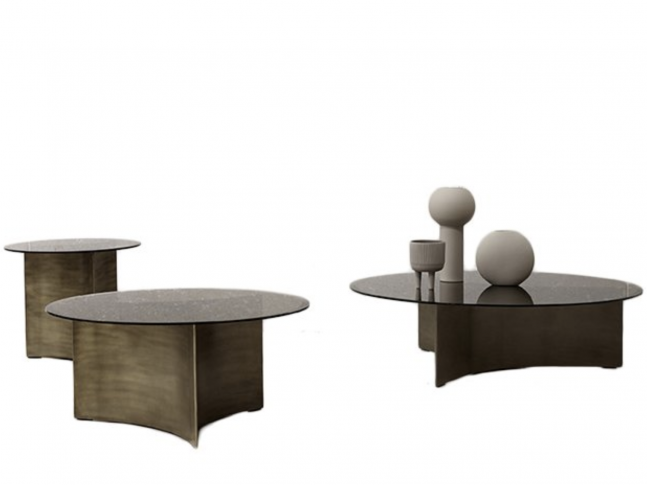 Konferenční / odkládací stůl Arc je inspirován elementární geometrií. Robustní základnu tvoří tři půlkruhy z bronzované oceli, na nichž je umístěn kulatý top z kouřového skla. Stolek je k dispozici ve třech různých velikostech, které lze mezi sebou shlukovat.
