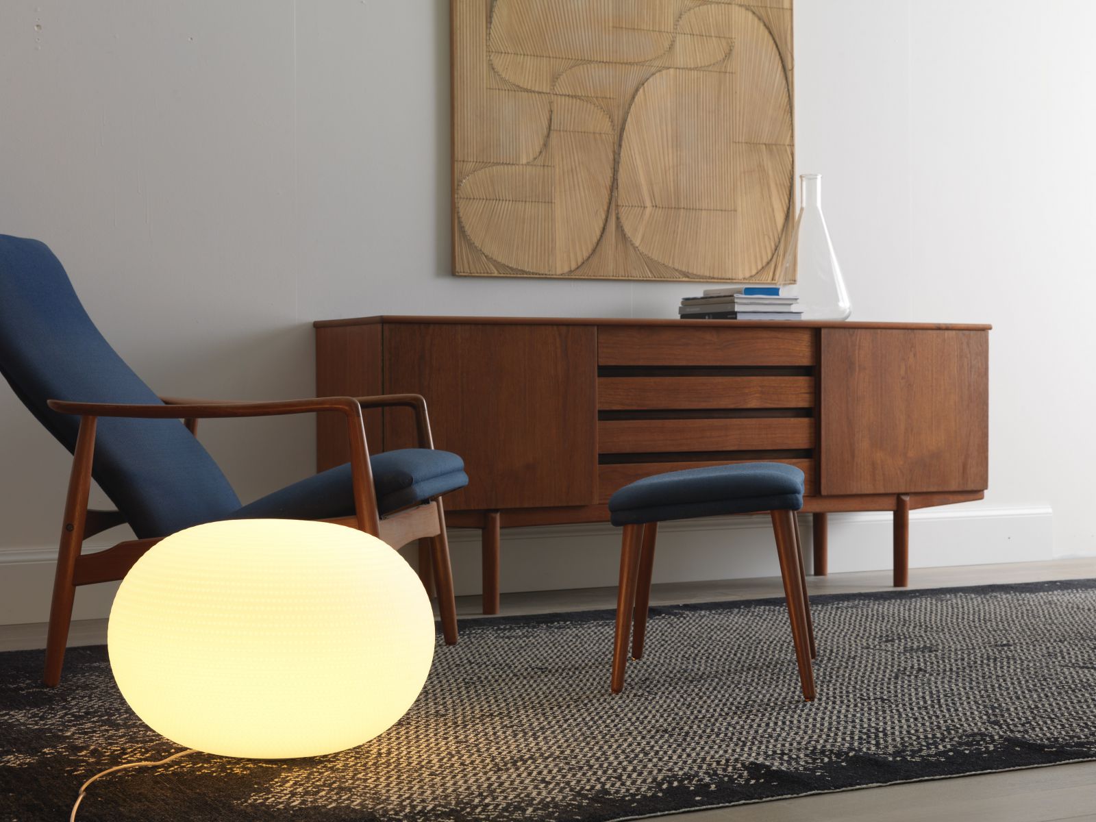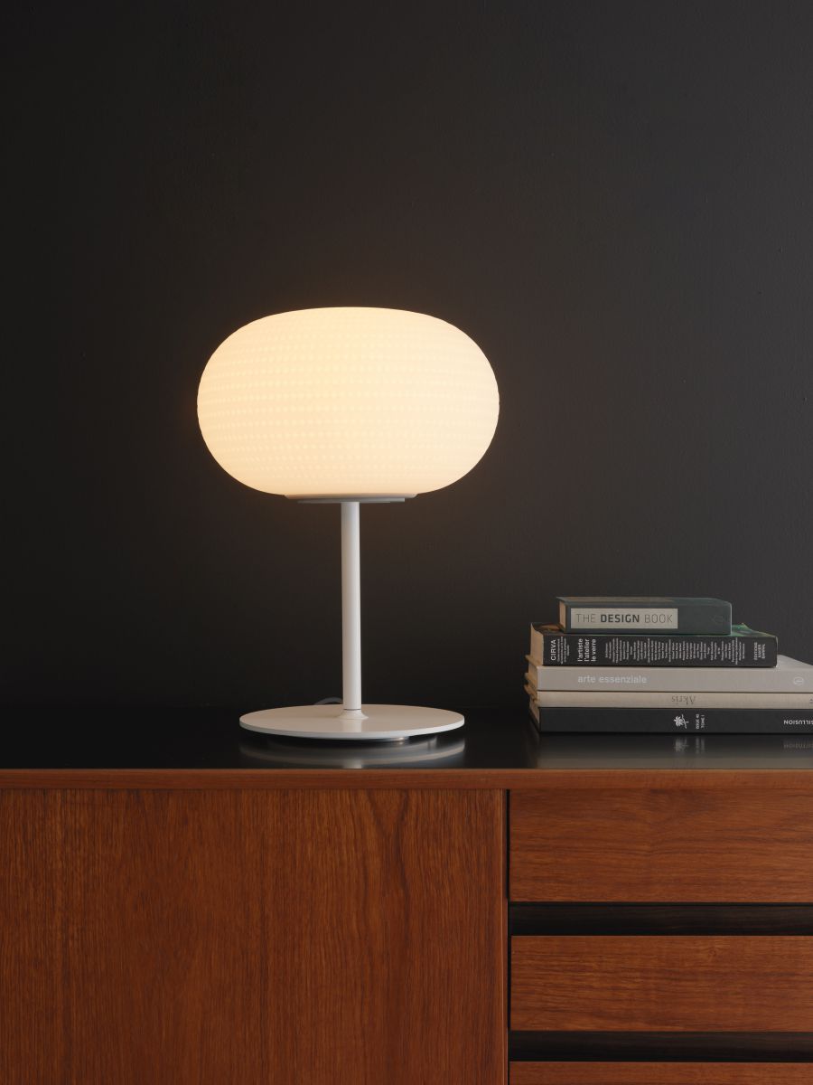 Stolní lampa Bainca je vybavena difuzérem ze skleněného foukaného skla s mléčně bílým saténovým povrchem. Povrch difuzéru je posetý jemnými drážkami, což přináší fefekt čerstvých stop ve sněhu. Je dotupná v několika různých velikostech.