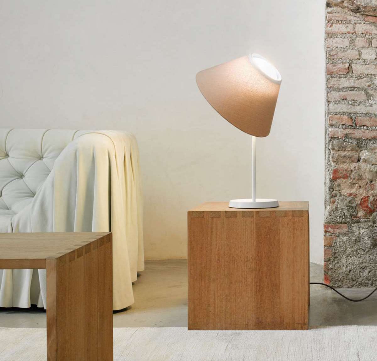Stolní lampa Cappuccina s difuzerem z látky s texturou a kovovým tělem.