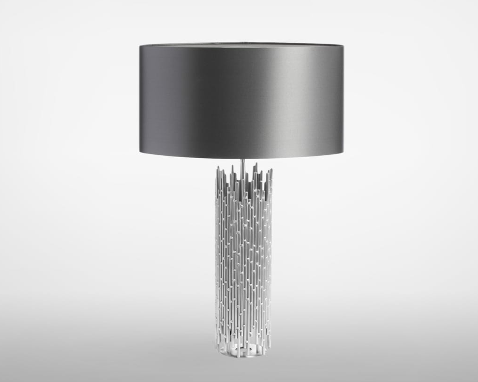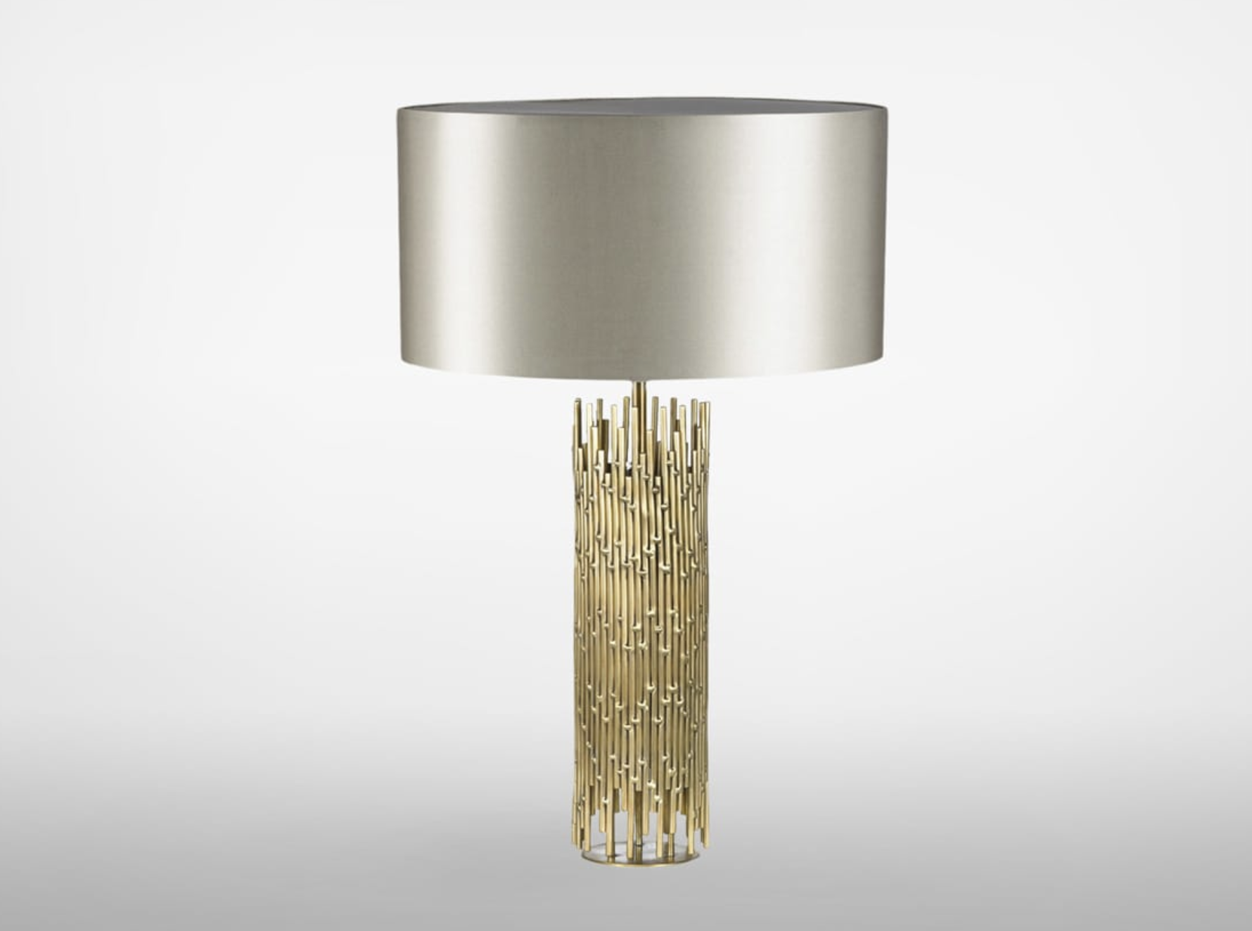 Stolní lampa Deco s kruhovým stínidlem a dekorativním asymetrickým podstavcem.