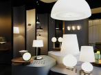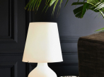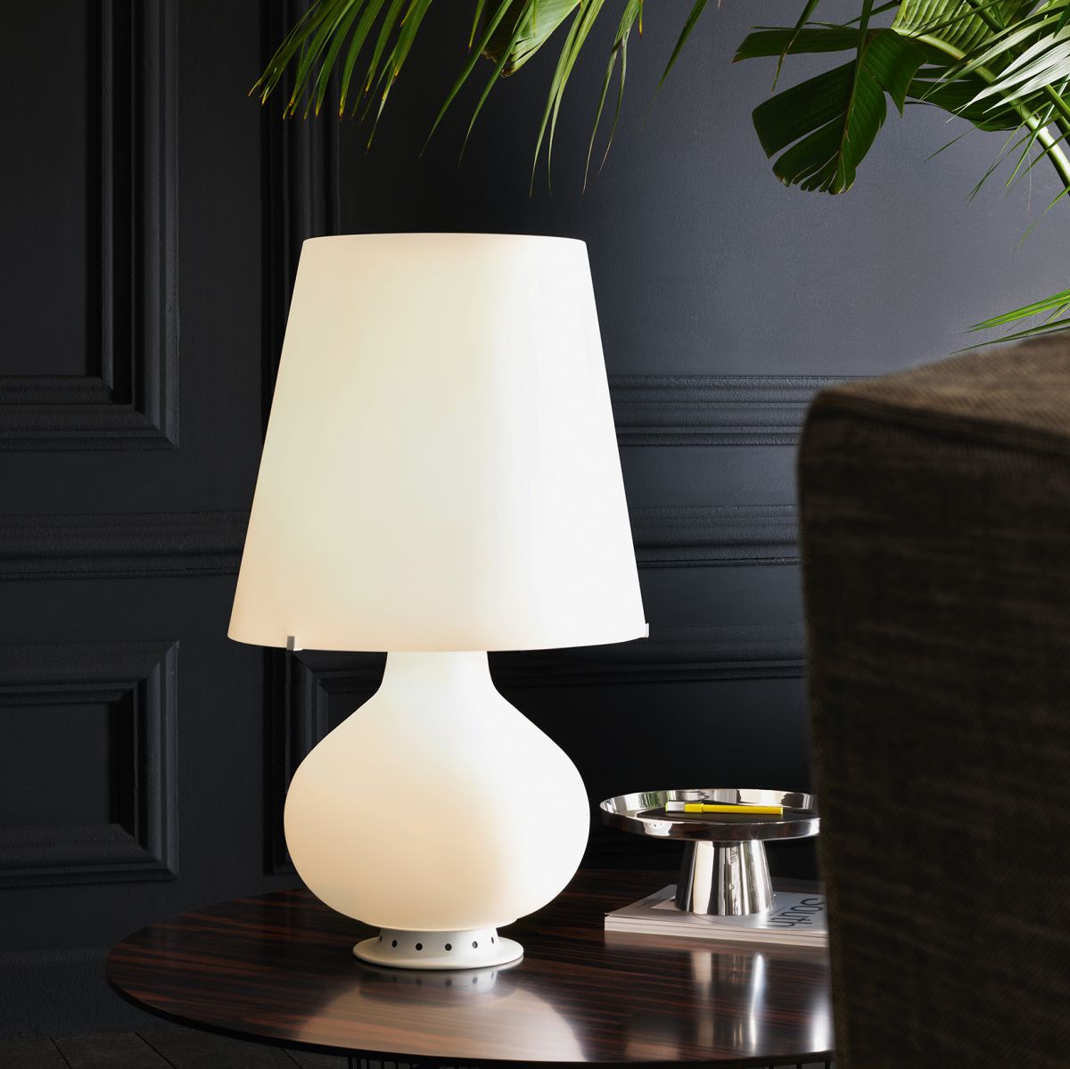 Lampa z bílého foukaného skla. Zvláštností lampy Fontana je více zdrojů světla. Základna i stínidlo mají svůj vlastní.