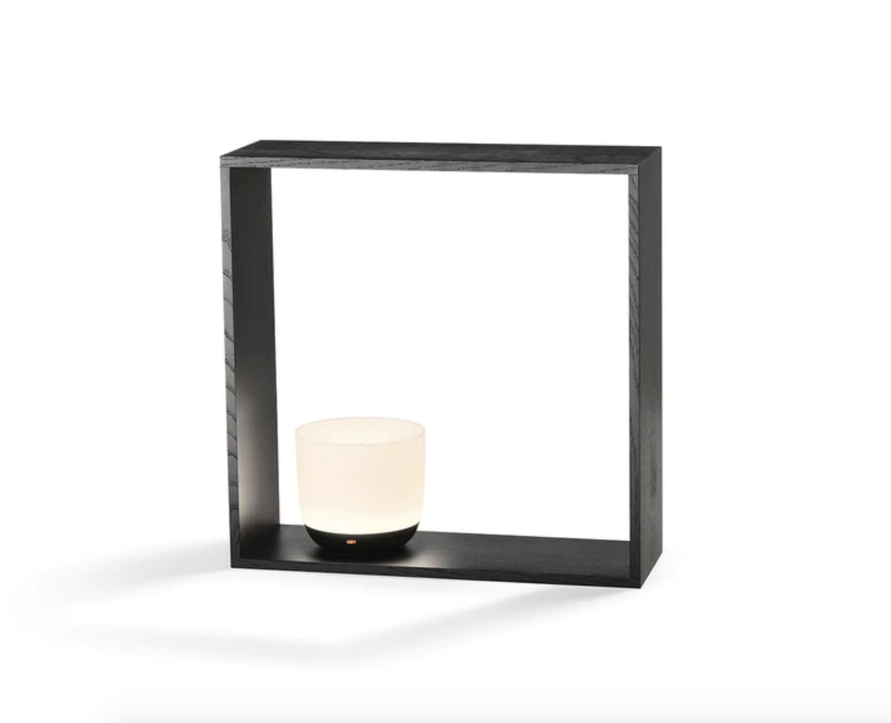Indukční dobíjecí lampa. Svítidlo a difuzor v opaleskujícím poleptaném polykarbonátu. Tlačítkový vypínač na svítidle se čtyřmi úrovněmi jasu.