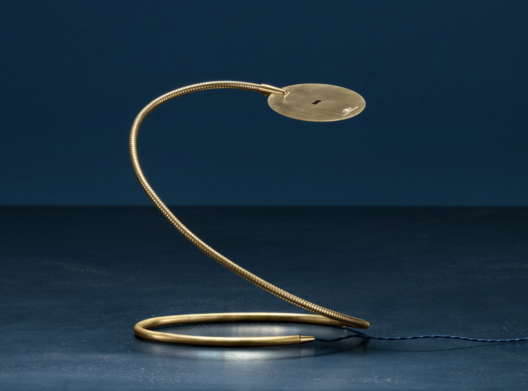 Vyrobeno výhradně z přírodní mosazi, svítící lampa Herem obsahuje tuhou základnu a pružné rameno, které podporuje tenkou oválnou desku, která zakrývá LED zdroj s bezdotykovým stmívačem.