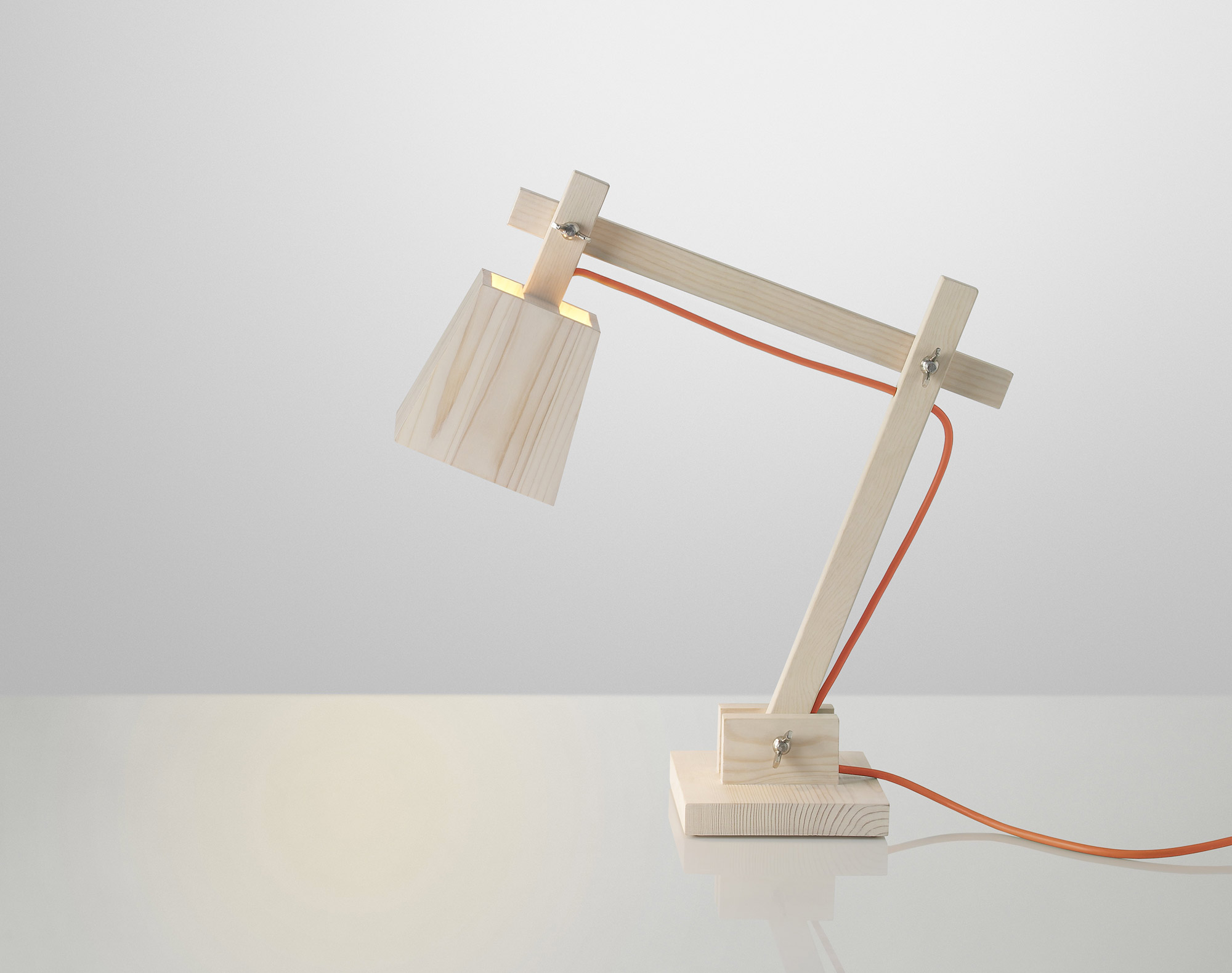 Stylová dřevěná lampa od dánské značky Muuto s vizuálním akcentem v podobě přiznaných spojů pomocí křídlových matek.