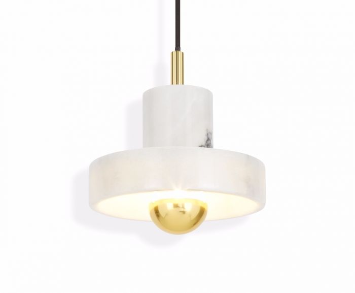 Závěsné svítidlo od Toma Dixona vyrobené z bíleho mramoru Morward. Kámen je řezán na nejmenší možnou tloušťku, takže se zdá, že je skoro průsvitný a světlo zdůrazňuje jeho vzorovaný povrch.