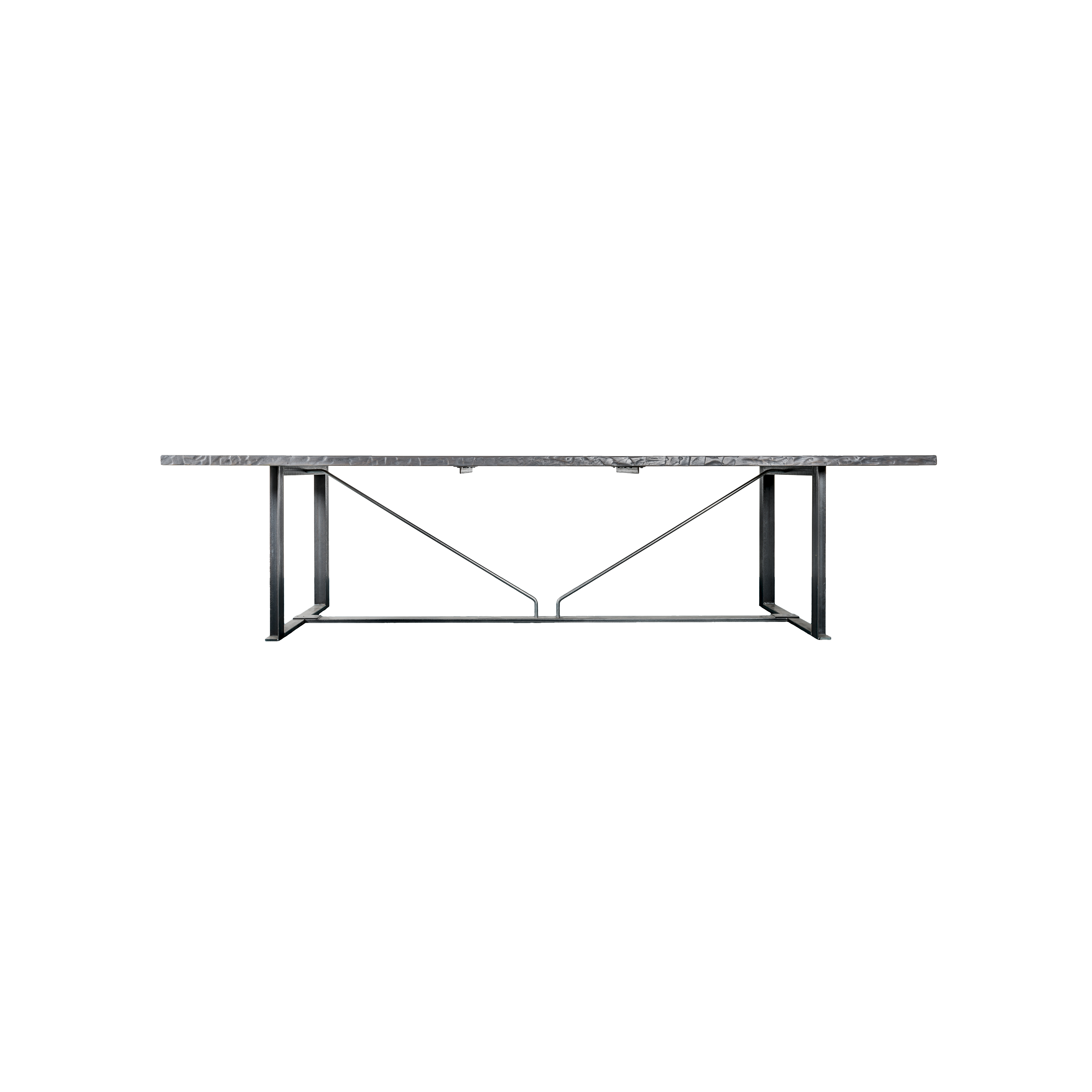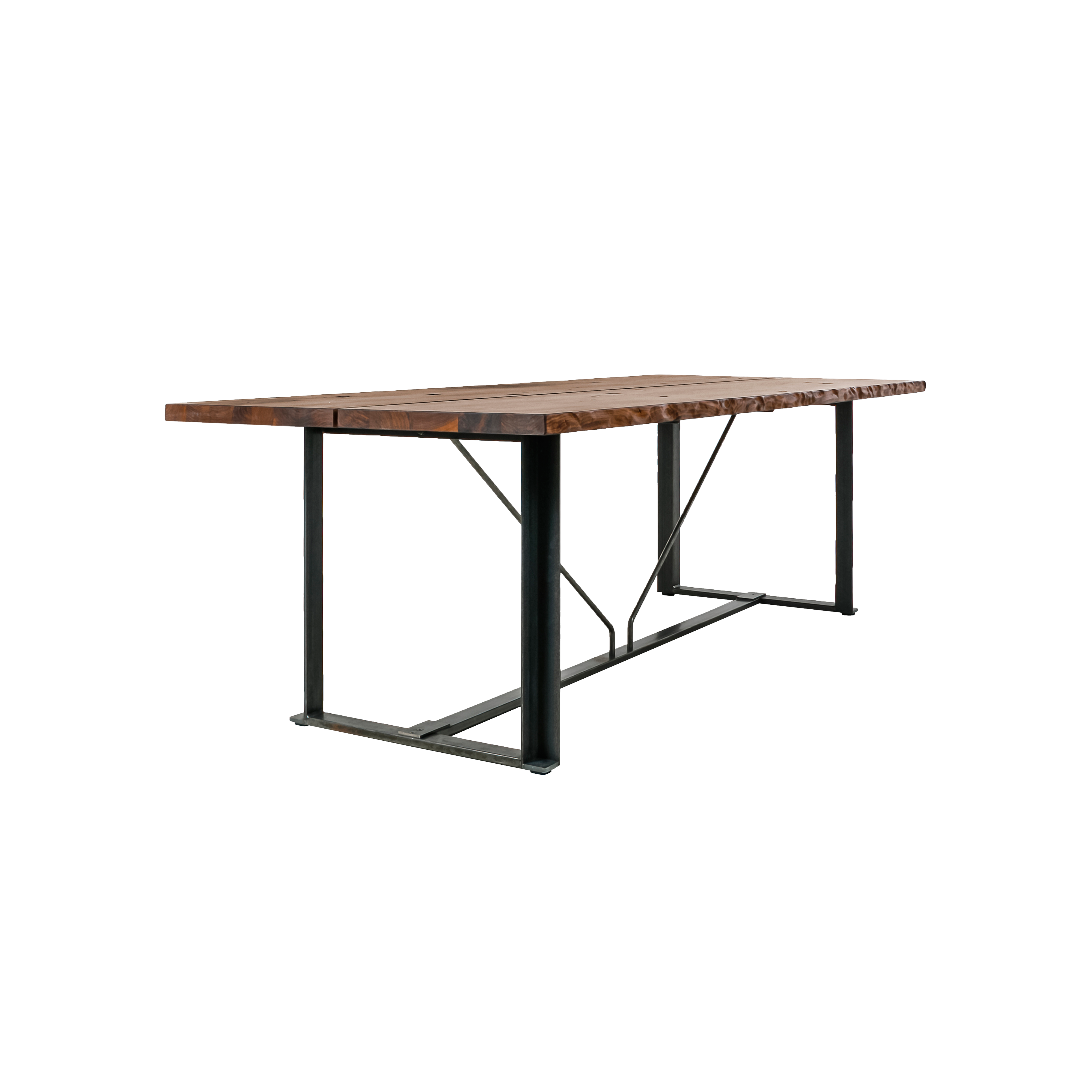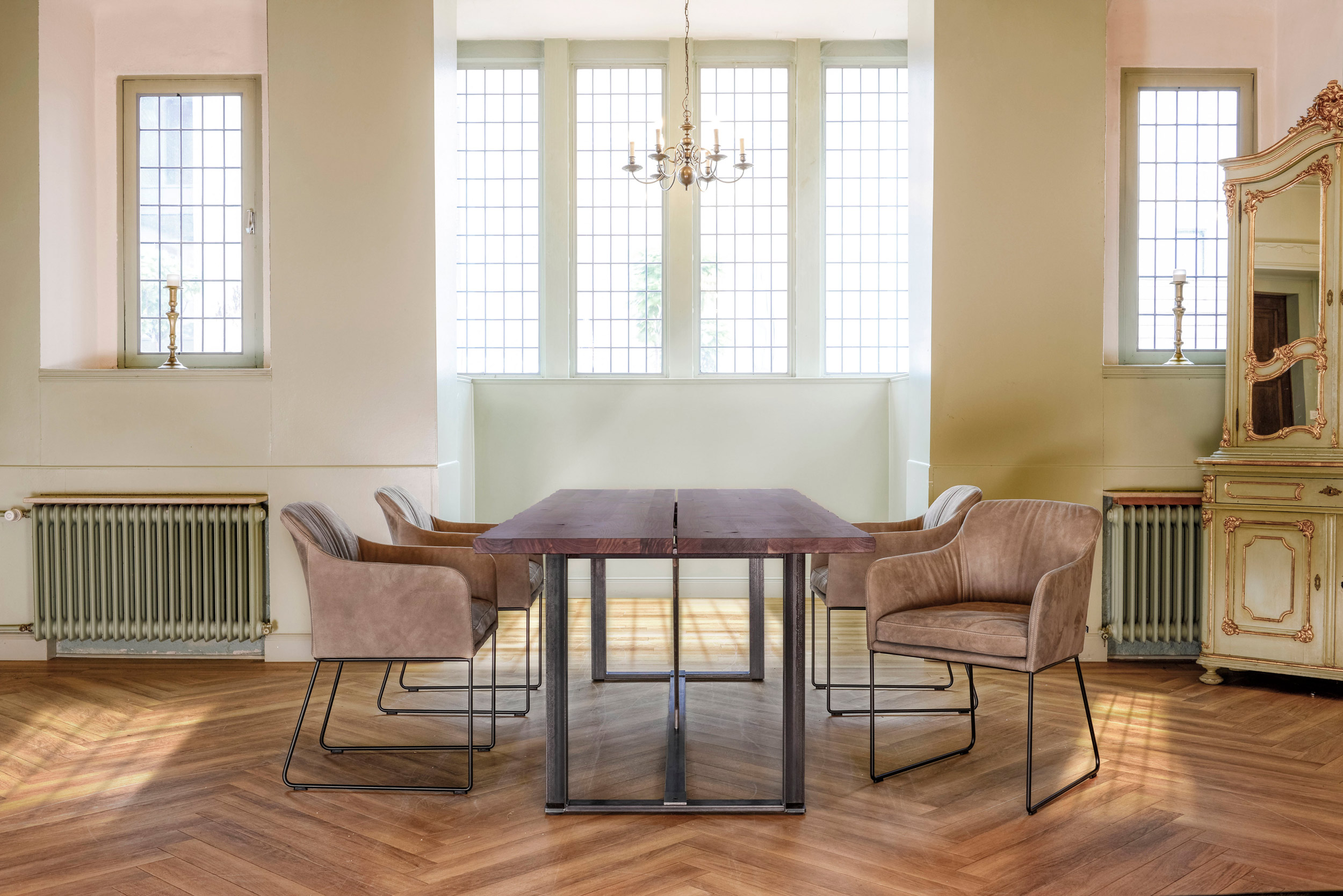Jídelní stůl s dřevěnou deskou a kovovými podnožemi.