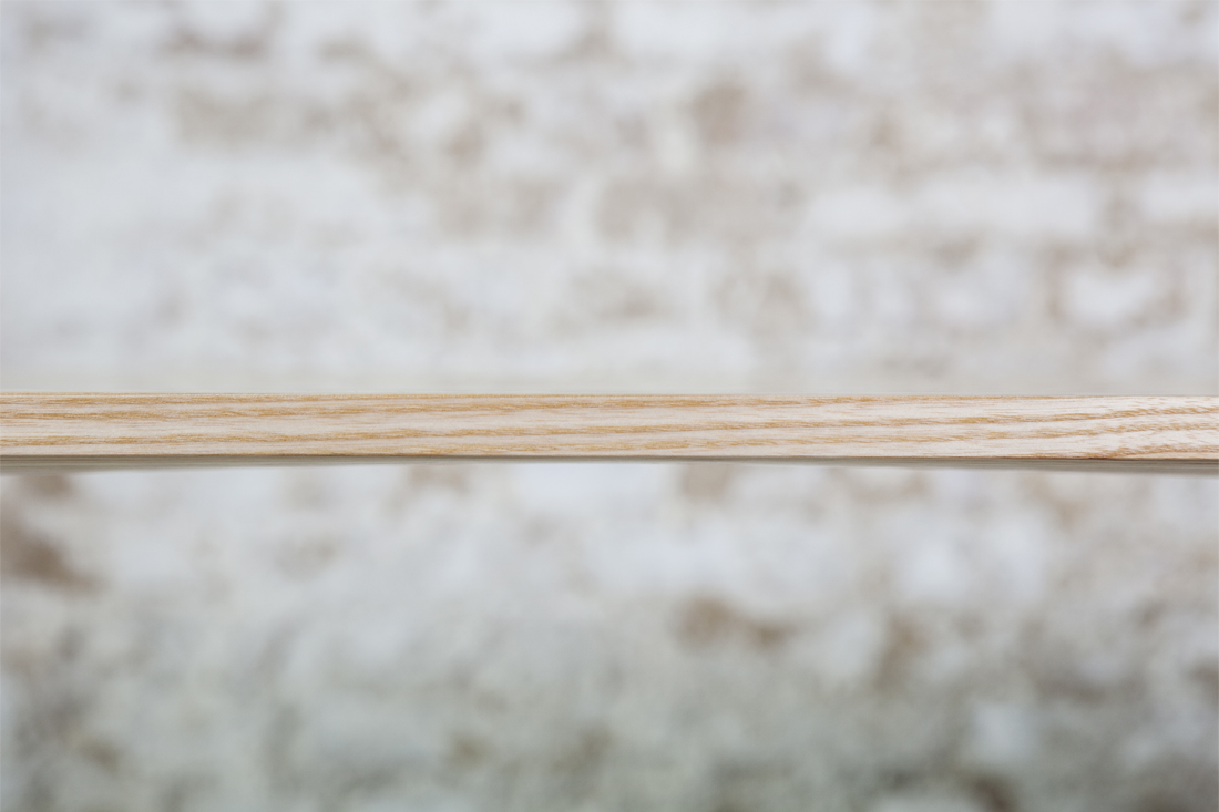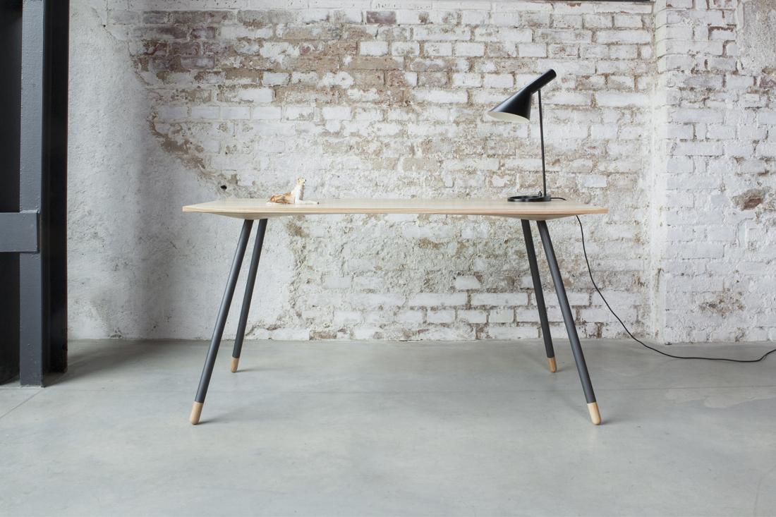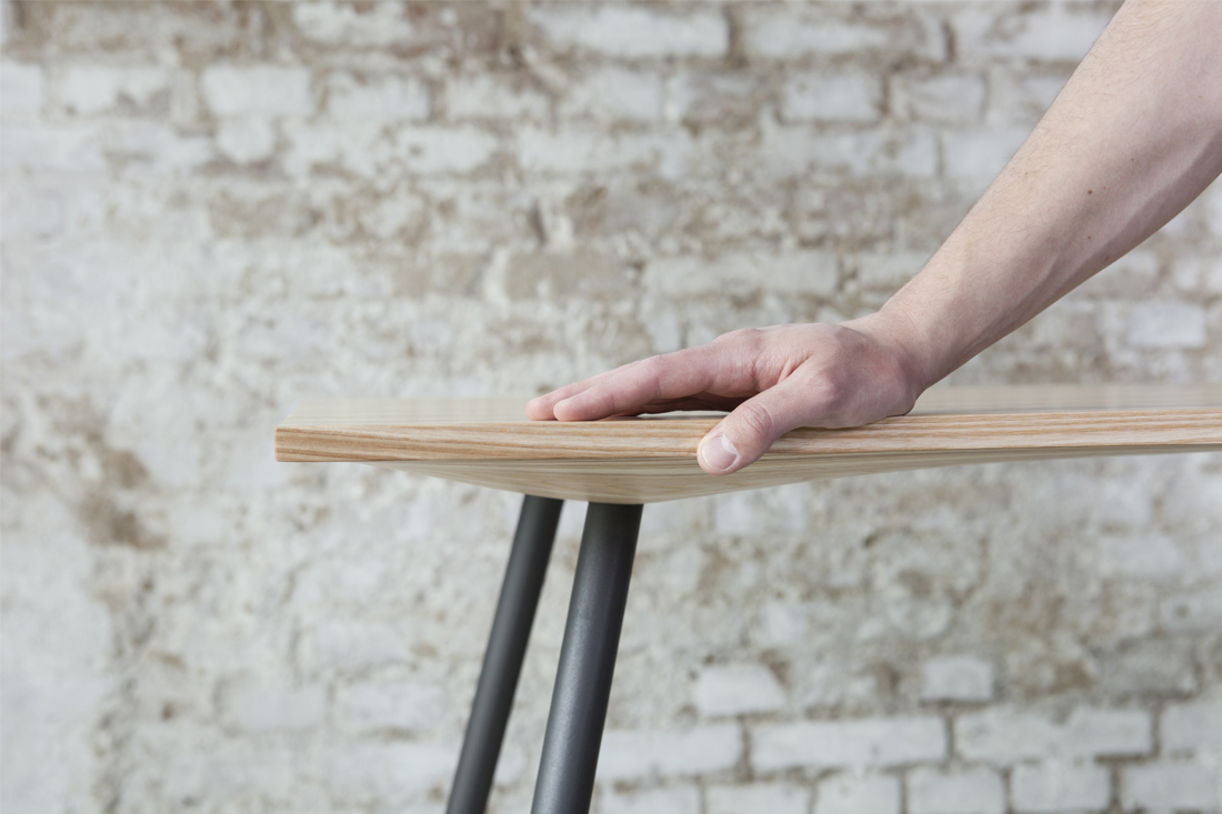 Pracovní stůl je tvořen z organicky tvarované desky z masivního jasanu a ze čtyř kovových nohou s dřevěným zakončením. Materiál je tam kde je potřeba. Kónicky umístěné nohy vycházejí z nejsilnějšího místa stolové desky. Dostatečné vzepření kovových nohou umožňuje absenci zavětrování konstrukce a jiných podpůrných prvků podnoží.