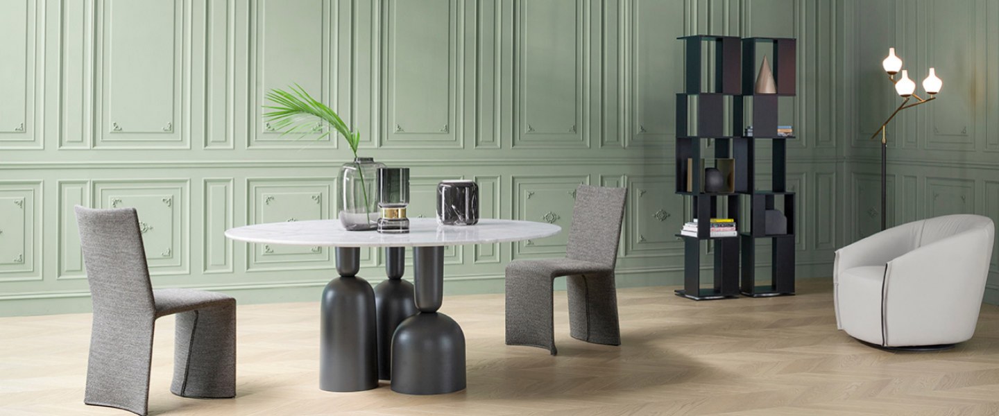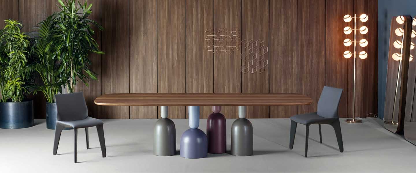 Tento stůl jako by byl postaven na sklenicích a lahvích, které obyčejně stávají na něm. Podnož stolu je z lakovaného kovu a deska může být z masivu, skla nebo keramiky. Stolní deska je k dostání v různých tvarech.