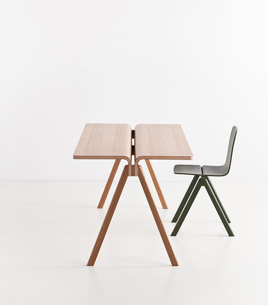 Stůl CPH150 je vyroben ze dvou lisovaných a ohýbaných desek, které jsou mezi sebou propojeny drážkami. Nohy mají áčkový vzhled, proto do sebe až 5 stolů perfektně zapadá. Dubové podnoží a deska jsou lakované transparentním lakem. Prohlubní mezi dvěma deskami je možné vést kabeláž od počítačů a notebooků a udržet tak na stole pořádek.