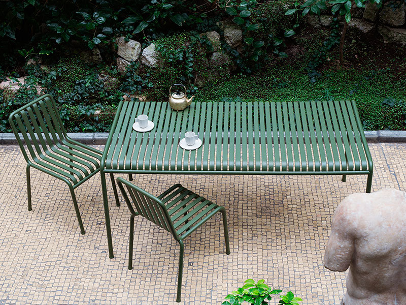 Venkovní stůl Palissade je součástí stejnojmenné kolekce. Je vyroben z pozinkované oceli vhodné pro venkovní užívání. Lze vybírat ze 4 barevných provedení a 2 velikostí. Kolekce zahrnuje židle, křesla, sofa či barové židle a je možné ji využít i v komerčních a restauračních zařízeních.