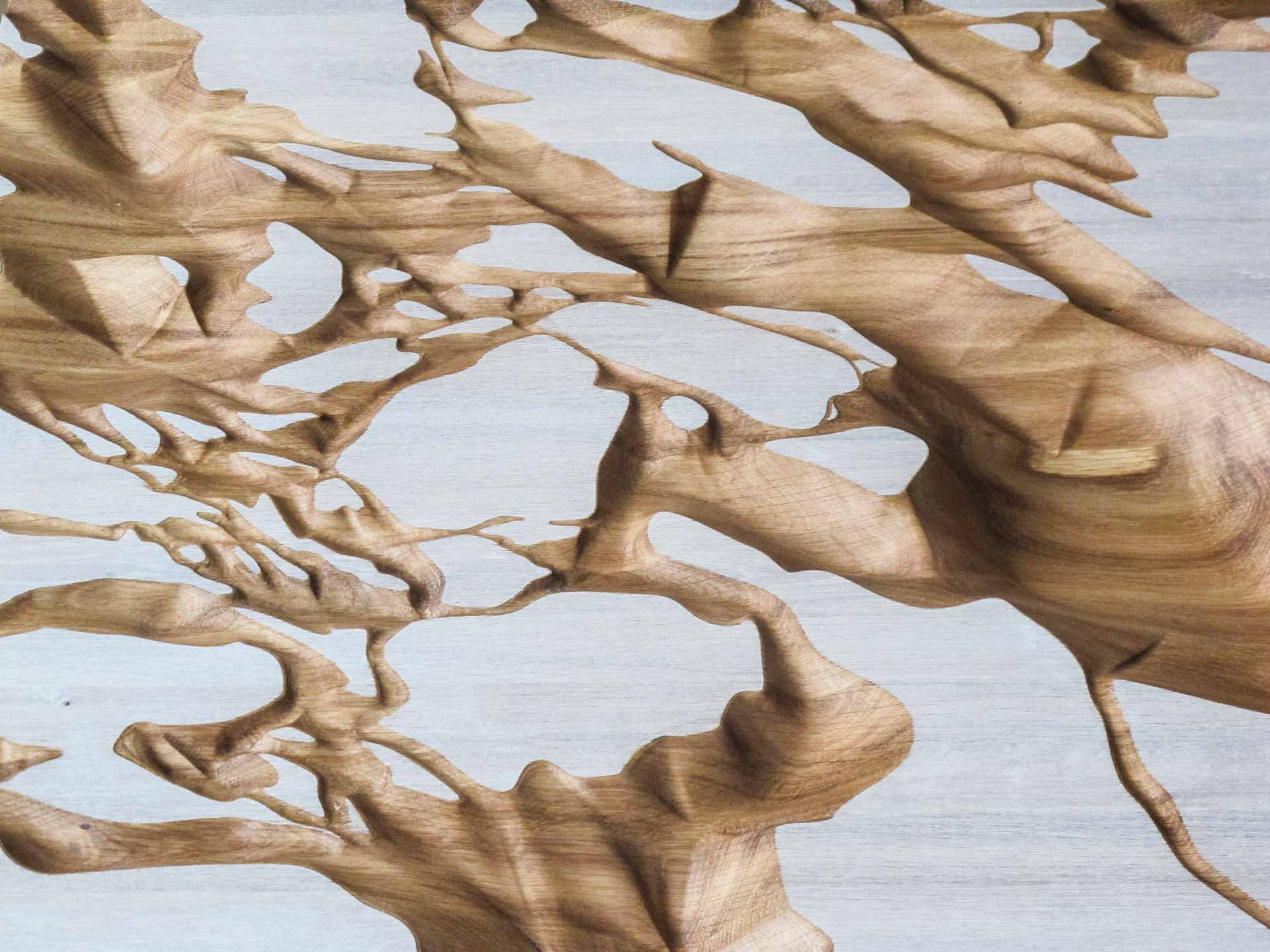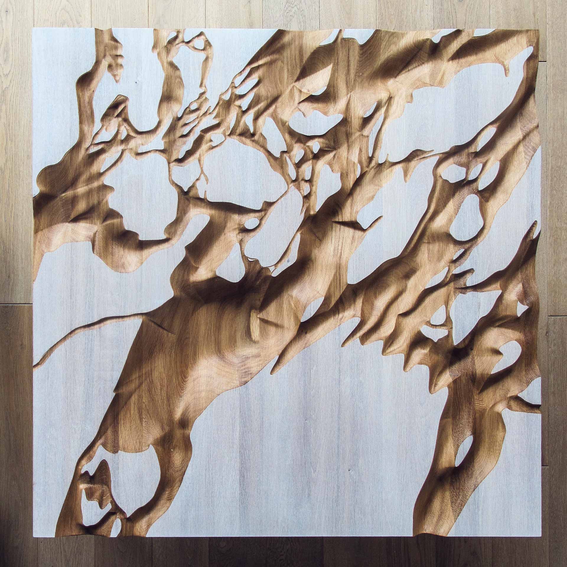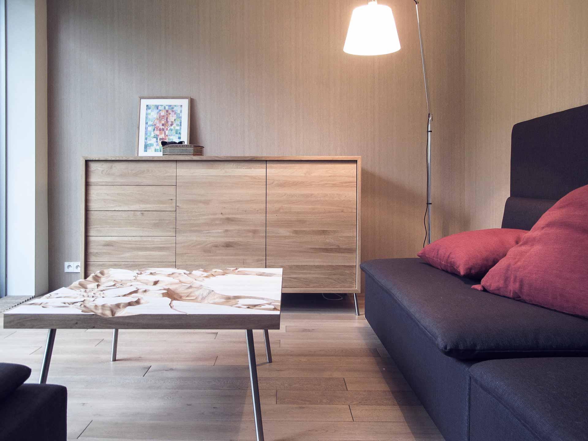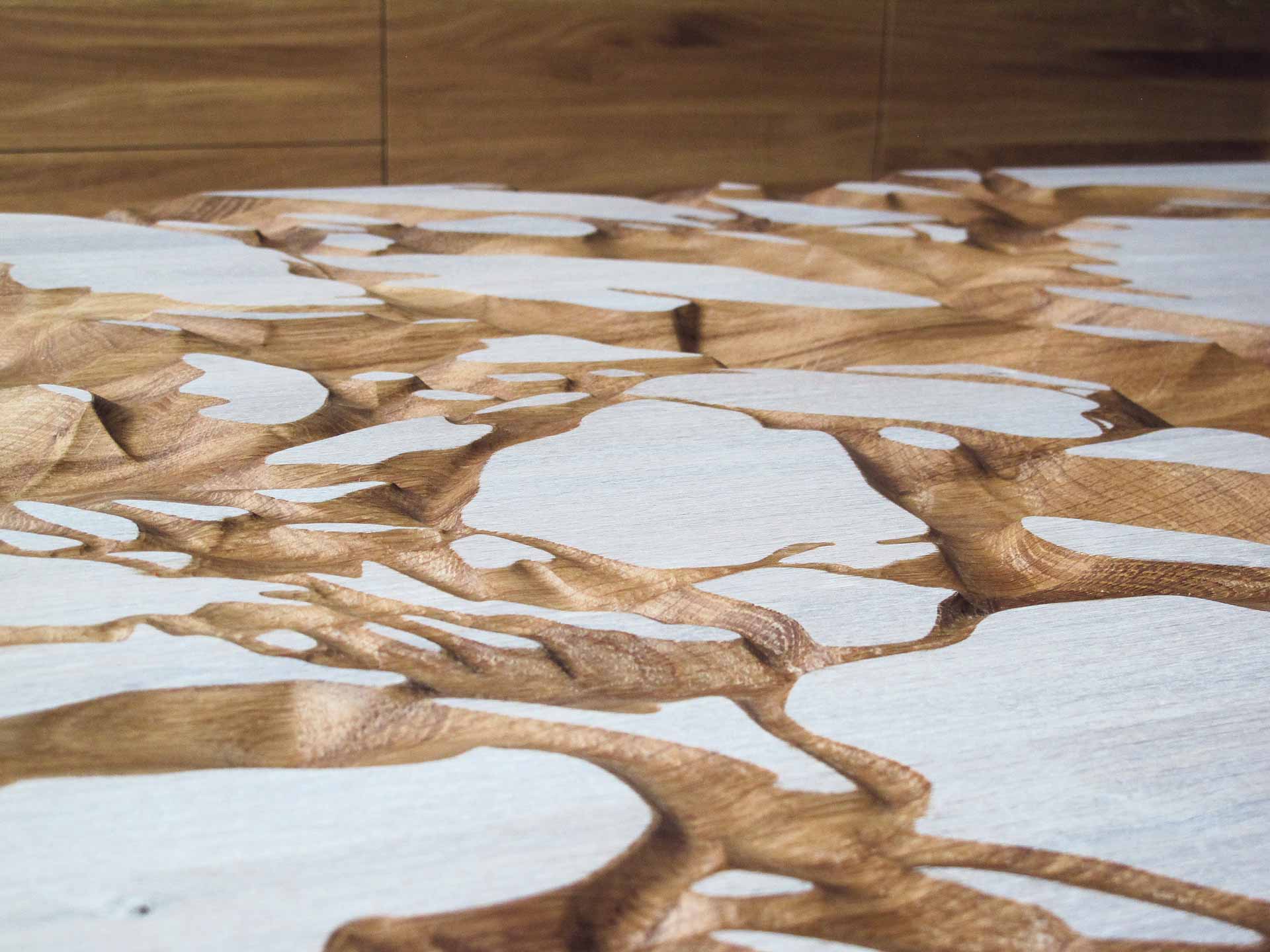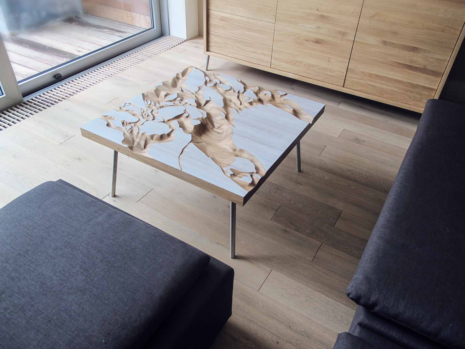 Tento neobyčejný stůl má v sobě originální důlky vytvářející jakousi krajinu, která umožňuje uživateli rozmanitý způsob hostění. Do různých údolí můžete sypat oříšky, chipsy, hrozinky, křížaly, olivy nebo cokoliv Vás napadne. Naopak bílé náhorní planiny jsou určeny pro odkládání nápojů. Materiál: dubové dřevo, osmo, bílé bio mořidlo, ocelová podnož