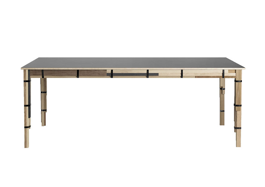 Stůl Keep Table má podnoží a rám ručně vyrobený z mixu kousků dřeva, které jsou k sobě spojeny kovovými sponkami v kombinaci s černým linoleem na povrchu desky. Jedná se o zbylý materiál na výrobu nábytku, který Keep stolu vdechuje hodnotu, charakter a originální design.