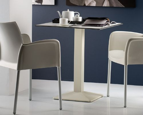 Pískovaná základna z litiny 400x400 mm, noha z ocelové trubky 80x80 mm, práškově lakovaná v různých povrchových úpravách. K dispozici je kartáčovaná nerezová ocel, chromovaná ocel nebo bukové dýhy. Výška stolu je 730 mm, nastavitelné nožičky na vyžádání. K dispozici je také verze stolu s výškou 1100 mm.