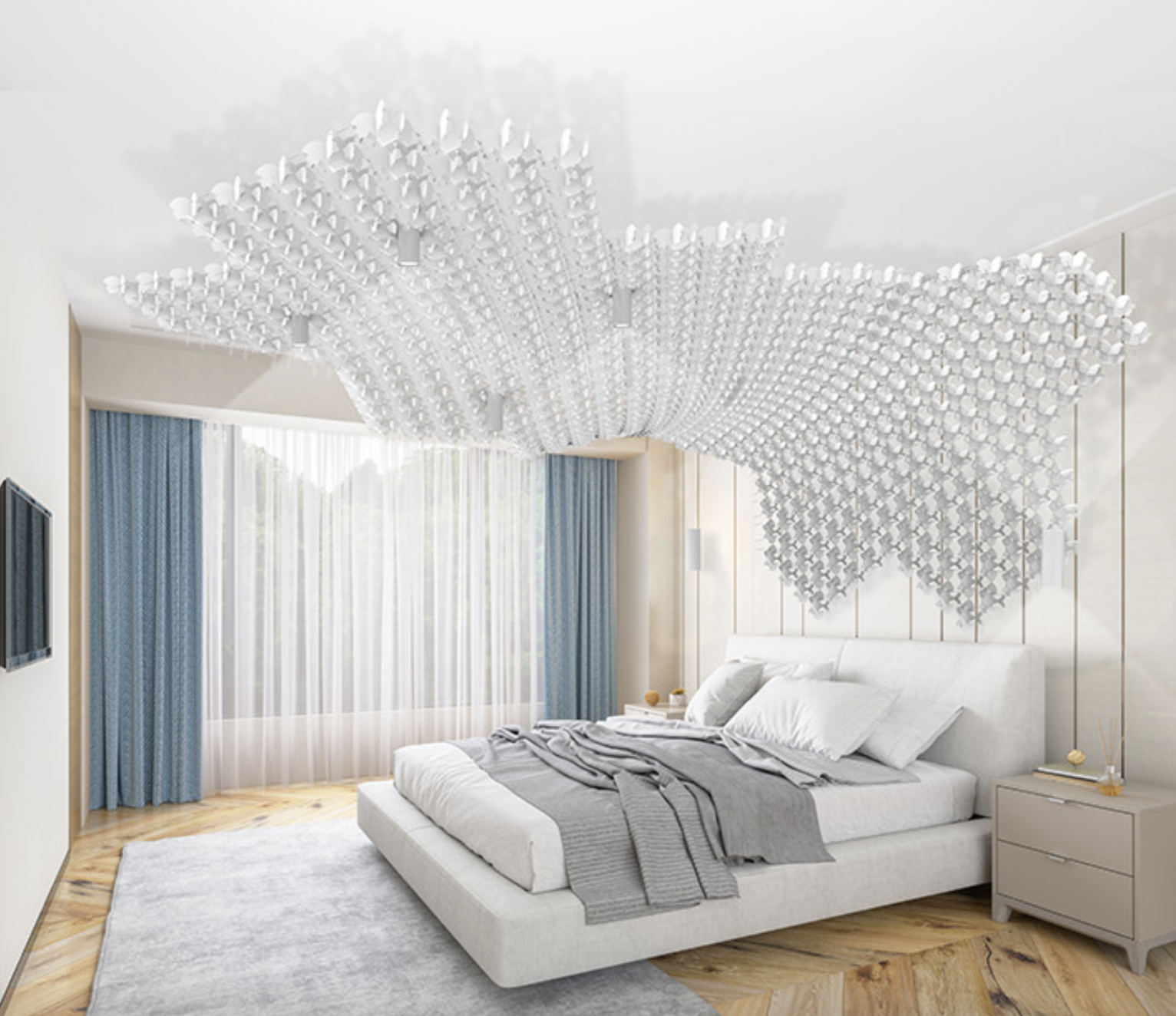 "Nevytvořili jsme lampu, ale strop." Těmito slovy představuje Miguel Arruda svou práci pro Slamp. Modulární systém vycházel ze symboliky a sochy. Transformací se vytvořil složený a spojený, metr dlouhý šestihranný tvar neboli sekce, které lze nekonečně kombinovat a vyplnit tak prostor plovoucí krajinou.