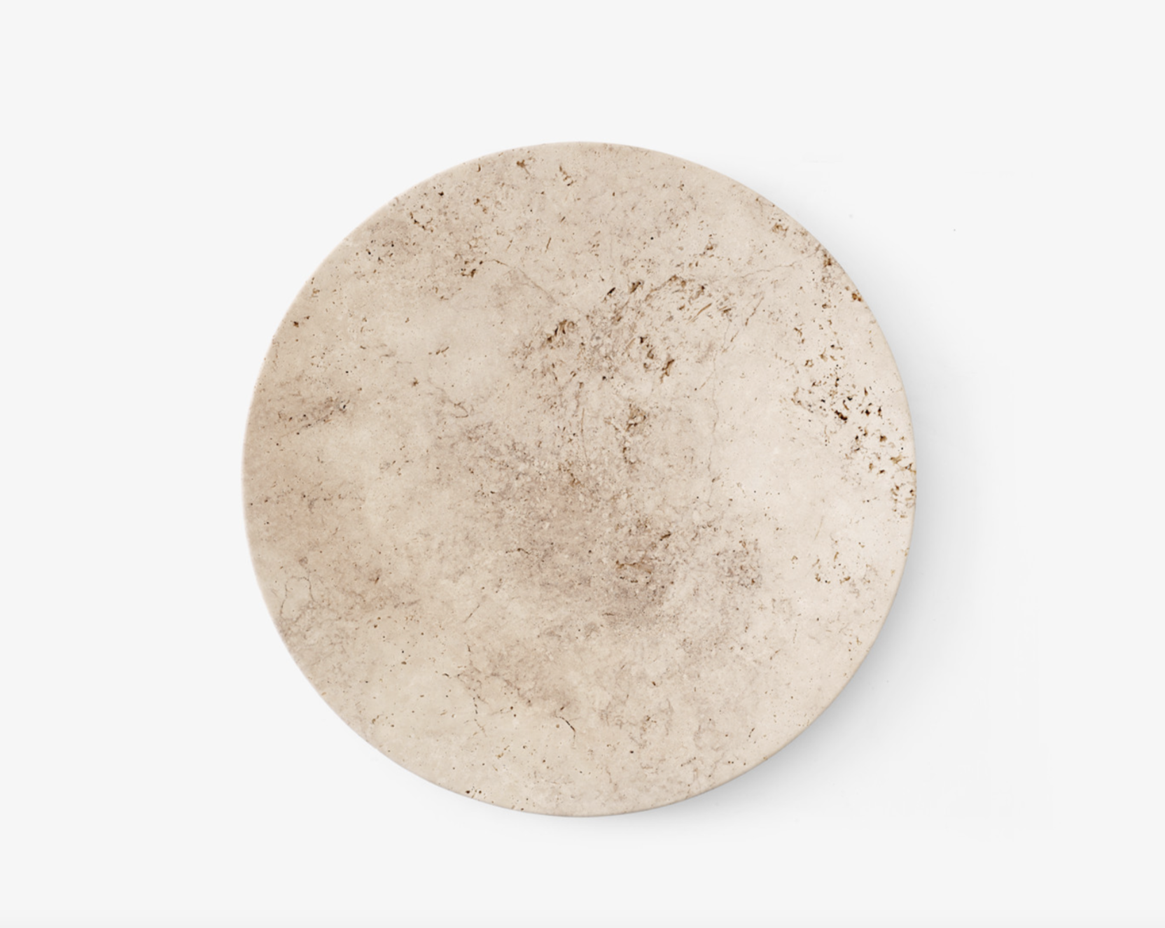 Ručně leštěný talíř, navržený společností Space Copenhagen, je součástí řady Collect, kurátorské řady krásně zpracovaného měkkého nábytku a domácích předmětů. Každá deska je vyrobena z béžové travertinové skály a je jedinečně texturovaným dílem s vlastním přirozeným vzorováním.