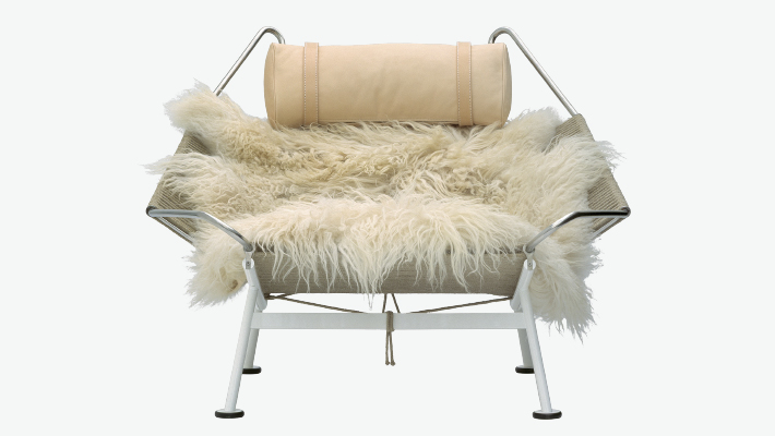 S rámem z masivní nerezové oceli, speciální vlajkovitá forma, která tvoří sedadlo a záda a dlouhosrstá ovčí kůže, která změkčuje ocelovou ostrost. Tato Wegnerova židle navržena roku 1950 představuje dokonalou a luxusní relaxaci!