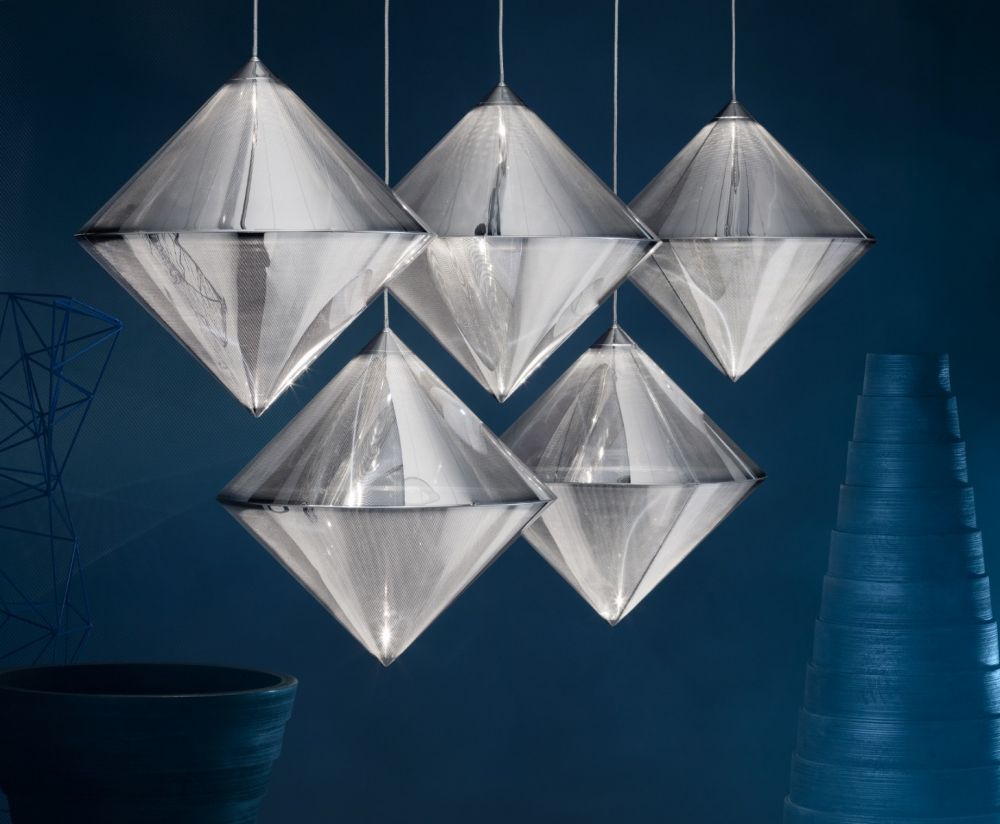 Kónické světlo vyrobené z perforované nerezové oceli. Pokud je světlo zapnuté, vychází z něj teplá záře, pokud je vypnuté, září samotné světlo chladnými stříbrnými odlesky.