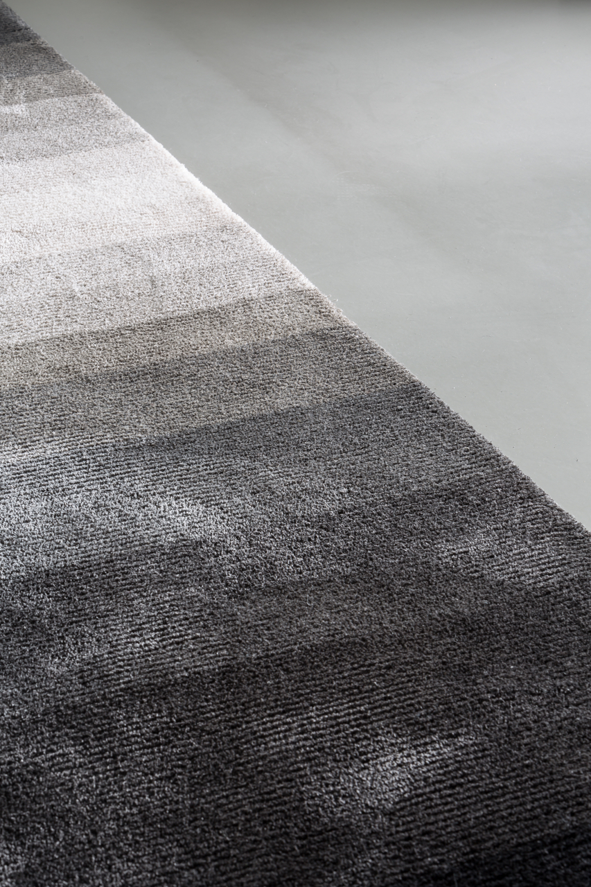 Luxusní ručně vyrobený koberec z nejkvalitnější novozélandské vlny a hedvábí od belgického výrobce JoV. Design koberce udávají nenápadné pruhy, které barevně přecházejí jeden v druhý a vytváří moderní ombré efekt. Barevnou paletu koberce tvoří elegantní přechod, od bílé až po černou barvu.