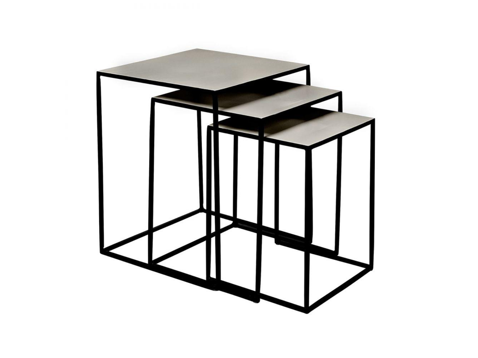 Trojset stolků ve tvaru kvádru s tenkými kovovými nohami a glazovanou krémovou deskou.