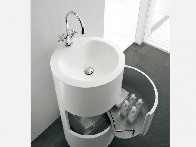 Čisté a jednoduché umyvadlo Moon s designem Arlex Interiors. Vyrobeno z materiálu corian.
