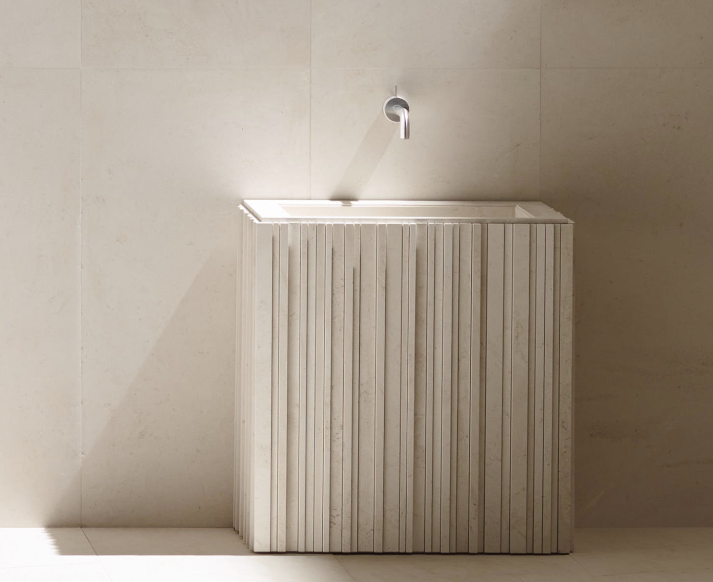 Volně stojící umyvadlo Ishiburo, navržené oceněným japonským architektem Kengo Kuma, se skládá z podstavce zakončeného obdélníkovou mísou. Texturou Ishiburo je řada pravidelných linií vytesaných do povrchu kamene, zdobí vnější část podstavce.