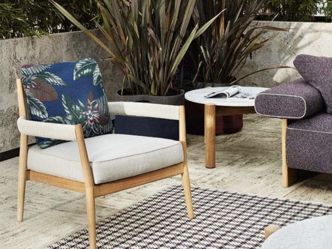 Křeslo Dine Out má díky vytříbeným detailům a příjemným tvarům pevný teakový rám zdobený ručně tkaným šedým polypropylenovým lanem kolem loketní opěrky a horní části opěradla.