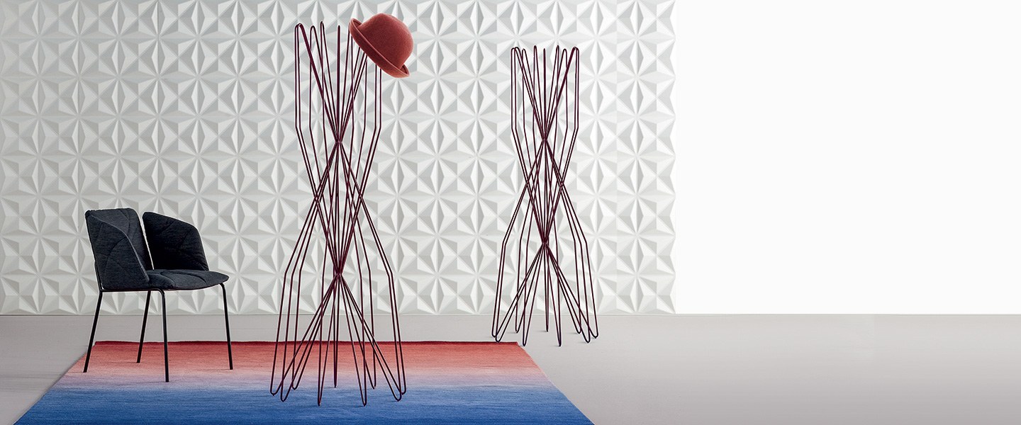 Designér Gino Carollo opakuje drátěné obrysy tak dlouho, až se z obyčejného užitkového věšáku stane objekt, který je praktický, ale zároveň i zajímavým oživením interiéru.