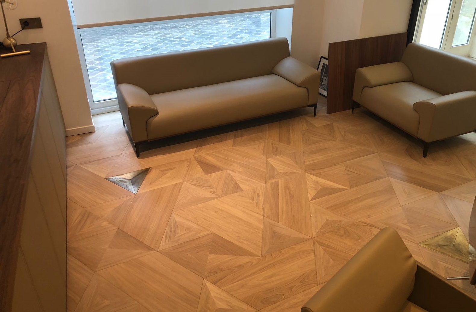 Jedná se o 2-vrstvé dřevěné parkety skládané do kazetových nebo geometrických vzorů. Moderní vzor "Trio" se skládá ze 3 jedinečných prvků: trojúhelník, diamant a lichoběžník. Standardní konstrukce je 4 mm vrchní vrstva a 11 mm březová překližka o celkové tloušťce 15 mm. K dispozici v 15 odstínech dubu a 2 odstínech vlašskéhoořechu. Výrobce: Vielaris