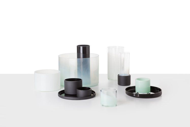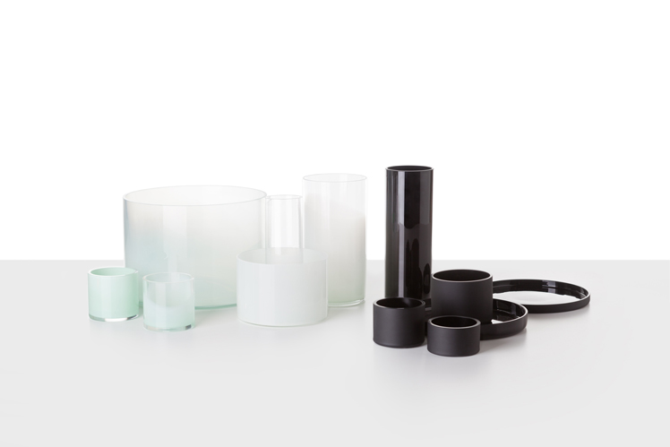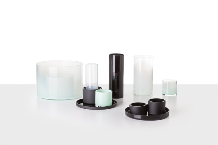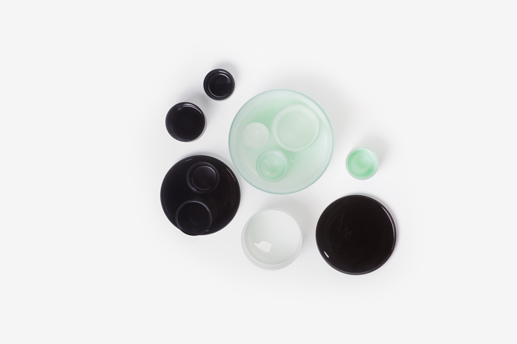 Kolekce skleněných nádob různých tvarů a barev. Univerzální pro domácnost nebo kancelář. Ručně foukané do forem z bukového dřeva.
