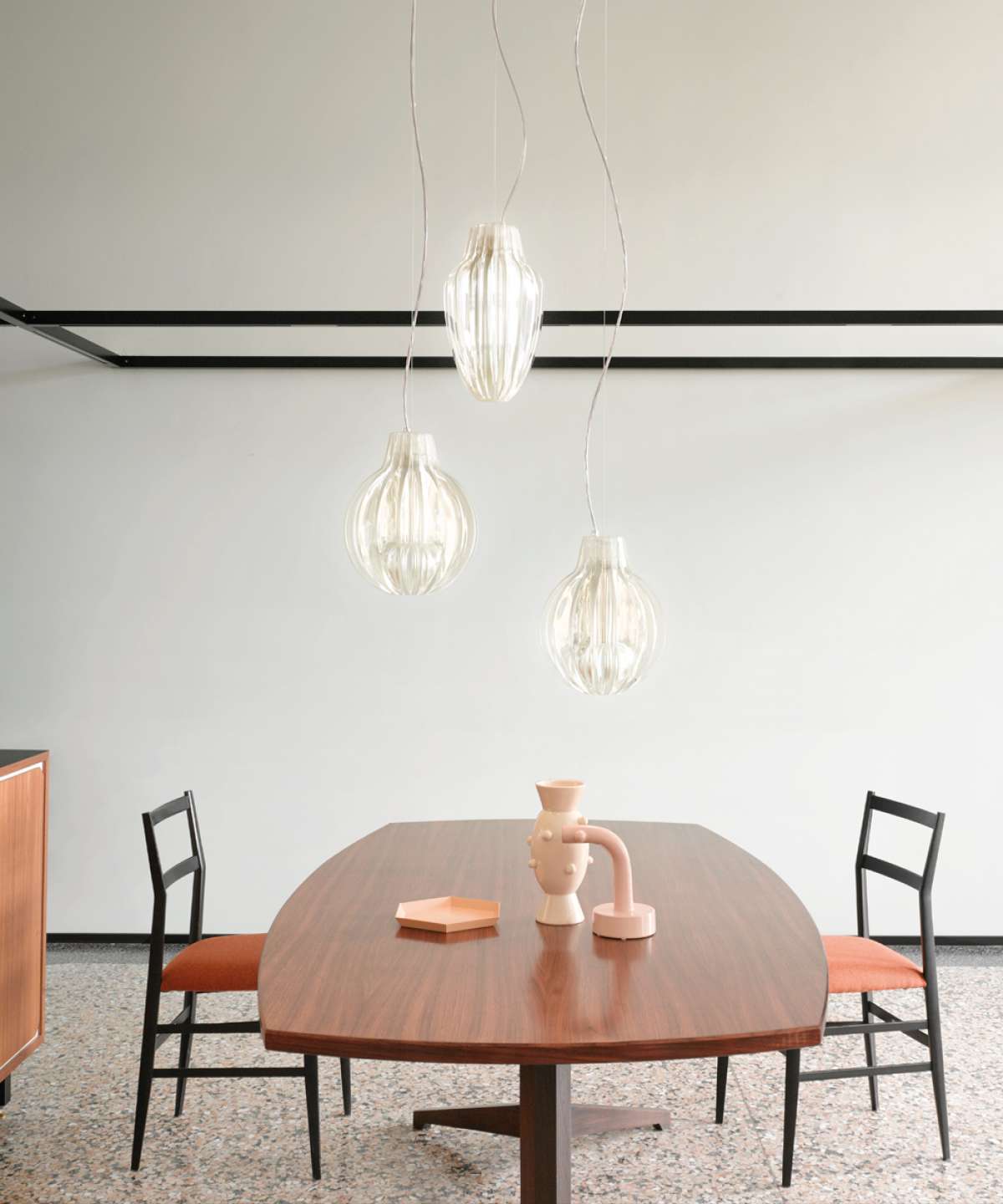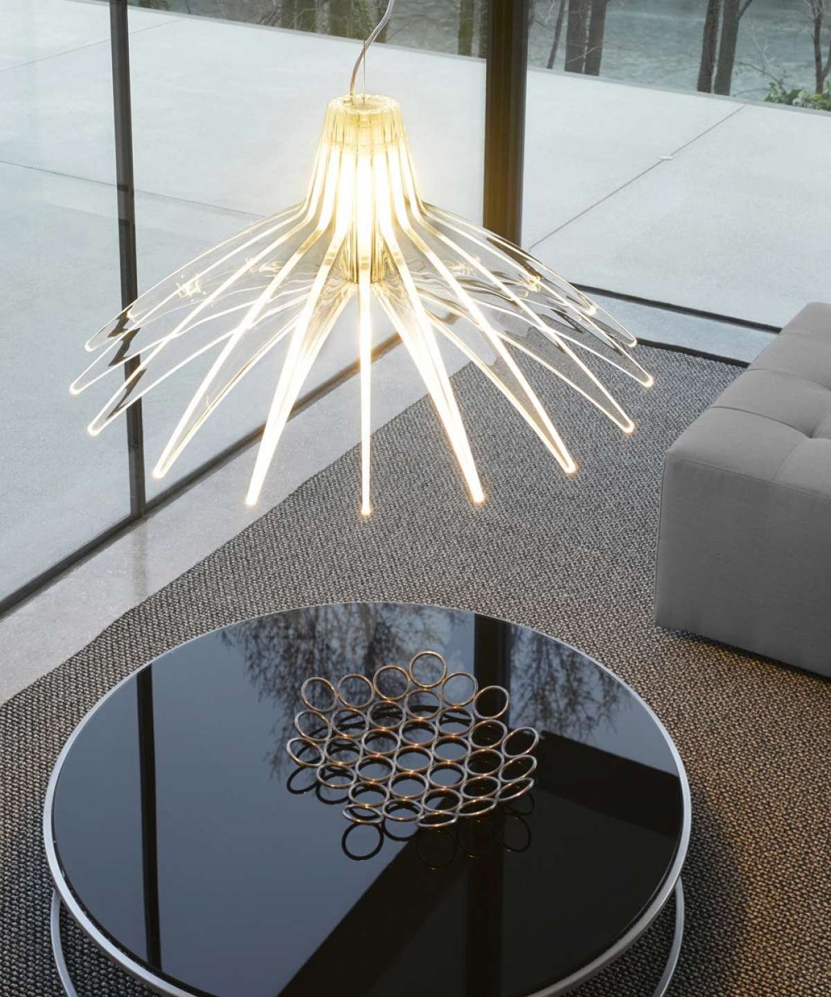 Hra průhlednosti, odrazu a lomu vytváří světlo se živým vizuálním dopadem. Pro vytvoření chromatických efektů mohou být položeny tři speciální filtry. Radiální struktura průhledných metakrylátových žeber zakrývá světelný zdroj a zabraňuje oslnění a rozptylu světla.