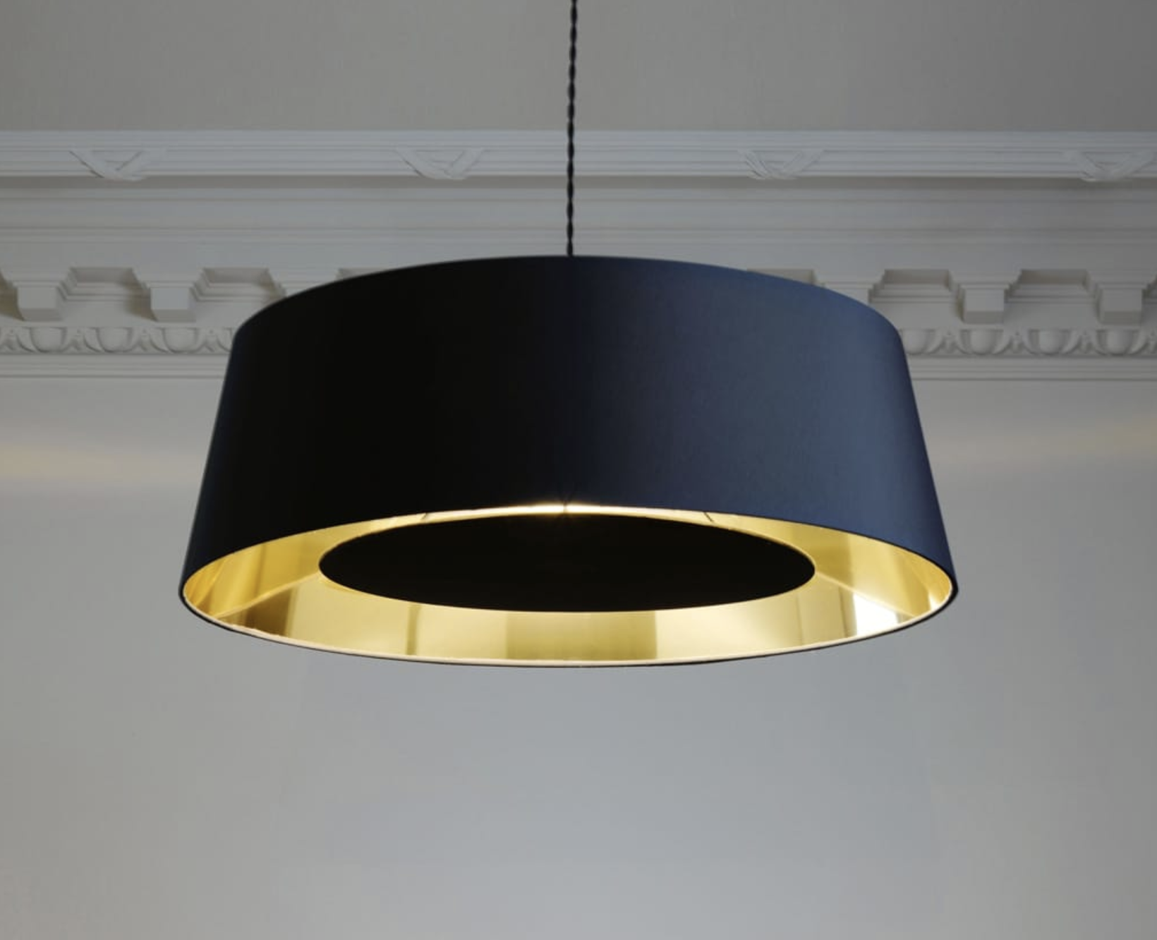 Kontrastující povrchy. Černá a zlatá. To je svítidlo Apollonaire se stínidlem, které zapadne kamkoliv.